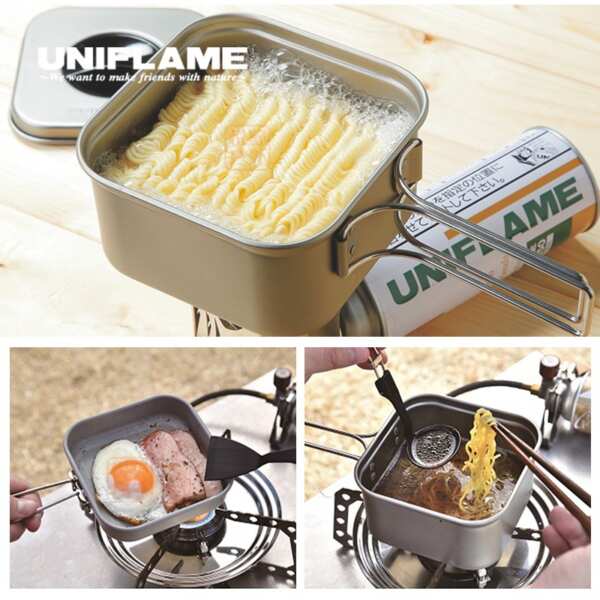 ชุดหม้อและกระทะ ทรงสี่เหลี่ยม ทำจากอลูมิเนียม น้ำหนักเบาทนทาน สามารถเก็บวางซ้อนกันเป็นชุดเดียวได้พกพาสะดวก ขนาดใช้งาน 1-2คน