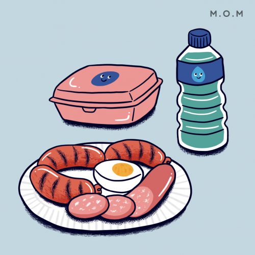 คุณพ่อคุณแม่ควรเตรียมอาหารของลูกไว้ในหีบห่อที่สะอาดและหยิบกินได้ง่าย เพื่อลดการปนเปื้อนสิ่งสกปรก เตรียมช้อน ส้อม และน้ำดื่มสะอาดใส่ขวดหรือกระติกน้ำให้พร้อม เพราะลูกอาจจะเล่นจนเหนื่อยและหิวมากกว่าปกติ คุณพ่อคุณแม่จึงควรมีอาหารที่เตรียมพร้อมไว้ให้ลูกกินรองท้อง รวมทั้งเมนูอาหารที่ทำง่าย ไม่ซับซ้อน และรวดเร็ว เช่น ไข่ต้ม ไข่ดาว และไส้กรอกที่ลูกชอบ
