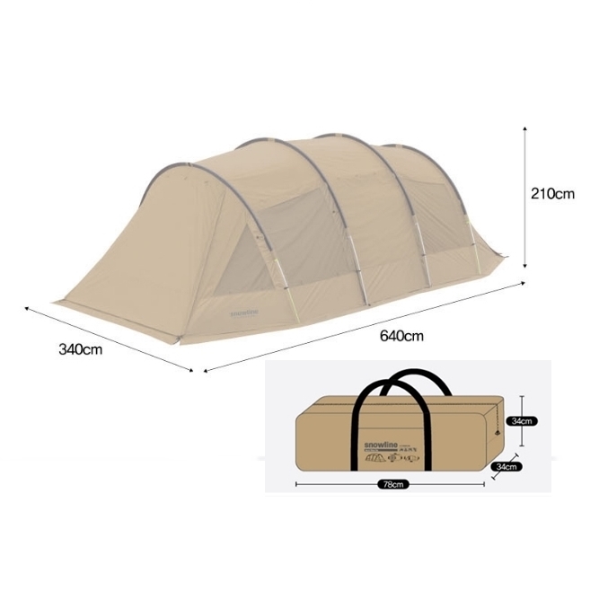 เต้นท์ทรงอุโมงค์ (Tunnel Tent) ขนาดใหญ่เหมาะสำหรับ 4-5 คน เป็นเต๊นท์ครอบครัวที่ทุกคนเฝ้ารอของ Snowline ด้วยผ้า75D ให้สัมผัสที่เย็นสบาย มี inner ขนาดใหญ่รวมมาในชุด ด้วยรูปทรงอุโมงค์บริเวณโถงด้านหน้ากว้างขวาง และประตูเต้นท์สามารถกางออกมาเป็นหลังคาขนาดใหญ่ได้ เพิ่มพื้นที่ด้านหน้าเต็นท์สำหรับนั่งพักผ่อนหรือทานอาหาร