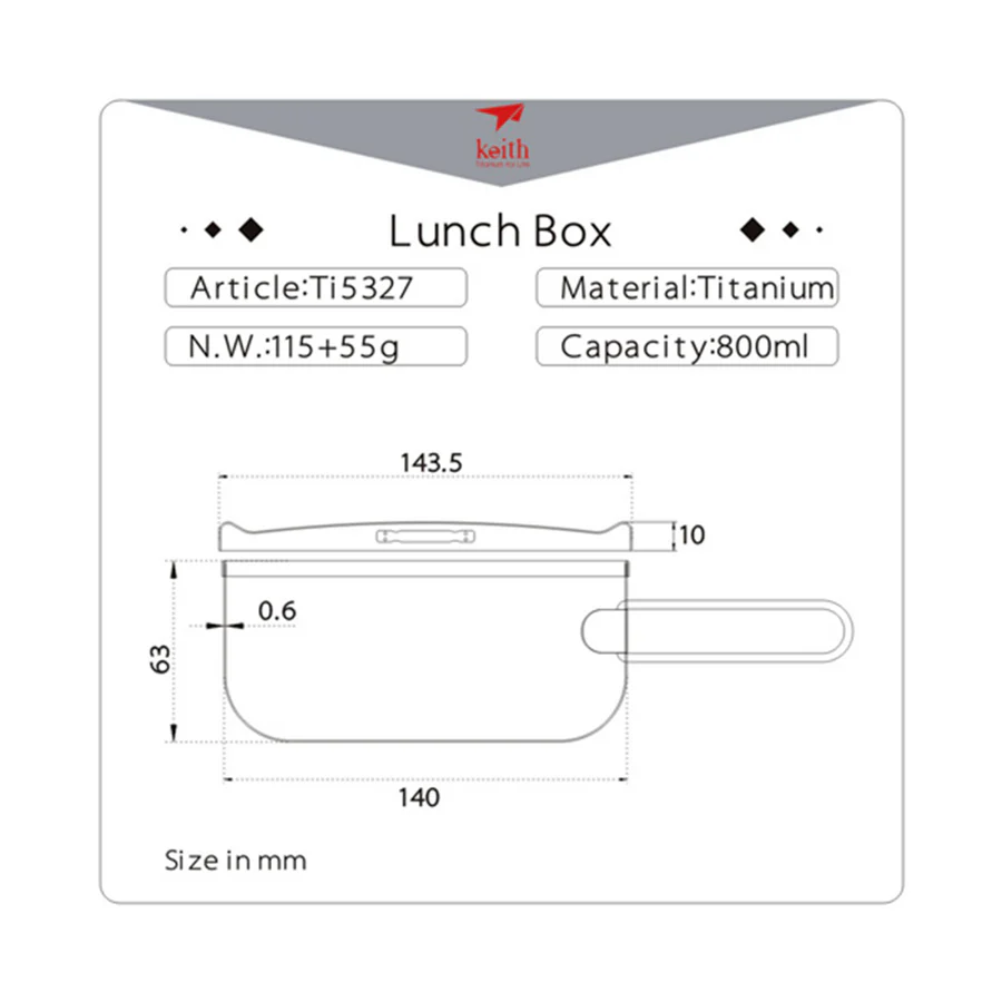 รายละเอียด : กล่องข้าวไทเทเนียม จาก Keith พร้อมฝาปิด ออกแบบมา 3 ขนาดคือ 800 ml , 1000 ml และ 1200 ml ผลิตจากโลหะไทเทเนียม น้ำหนักเบา ที่กล่องข้าวมีด้ามจับซึ่งผลิตจาก stainless steel ช่วยให้สามารถจับถ้วยได้แม้จะบรรจุของร้อนอยู่ มีฝาปิดที่ออกแบบมาอย่างดี มีช่องด้านข้างที่ออกแบบมาสำหรับให้ใช้ช้อนเกี่ยวเพื่อเปิดฝากล่องได้ สามารถใช้เป็นหม้อประกอบอาหาร หรือใช้เป็นกล่องใส่ข้าว สำหรับเดินทางได้