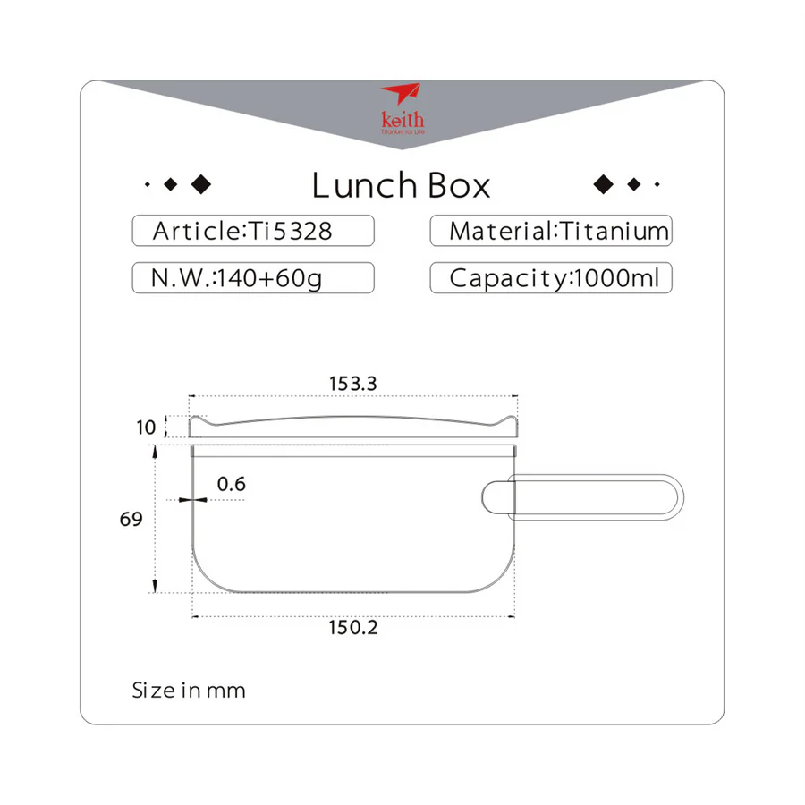 รายละเอียด : กล่องข้าวไทเทเนียม จาก Keith พร้อมฝาปิด ออกแบบมา 3 ขนาดคือ 800 ml , 1000 ml และ 1200 ml ผลิตจากโลหะไทเทเนียม น้ำหนักเบา ที่กล่องข้าวมีด้ามจับซึ่งผลิตจาก stainless steel ช่วยให้สามารถจับถ้วยได้แม้จะบรรจุของร้อนอยู่ มีฝาปิดที่ออกแบบมาอย่างดี มีช่องด้านข้างที่ออกแบบมาสำหรับให้ใช้ช้อนเกี่ยวเพื่อเปิดฝากล่องได้ สามารถใช้เป็นหม้อประกอบอาหาร หรือใช้เป็นกล่องใส่ข้าว สำหรับเดินทางได้
