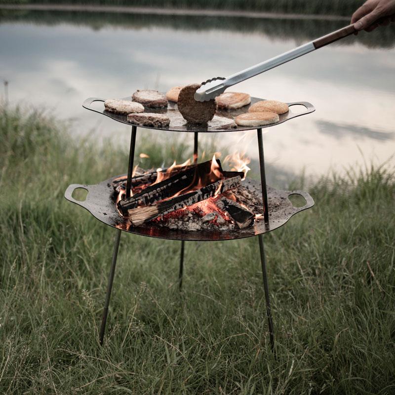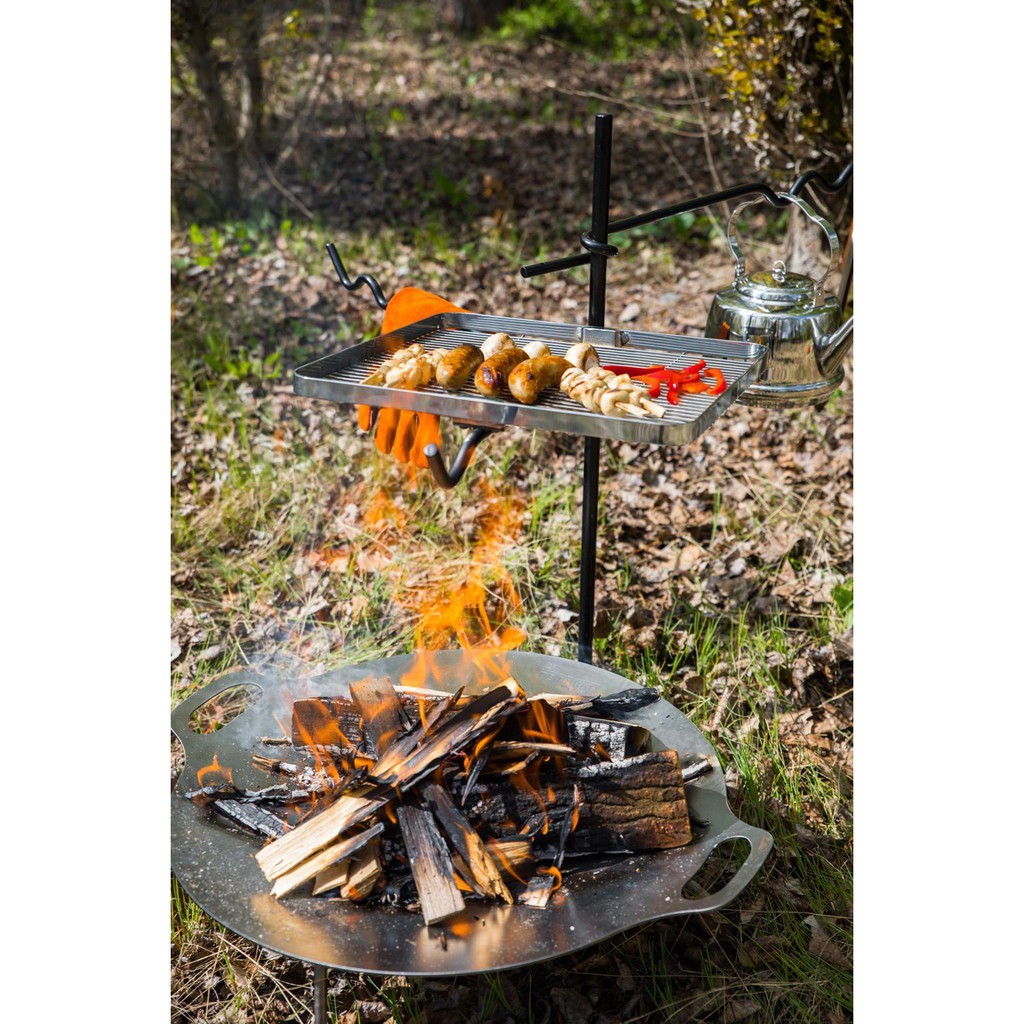 กระทะเหล็กสำหรับย่างอาหาร และถาดก่อไฟ ที่ทำจากเหล็กคุณภาพเยี่ยมขึ้นรูปอย่างดี โดยไม่ทำความเสียหายให้พื้นที่ด้านล่าง ตัวถาดสามารถวางฟืนบนขาตั้งสามขา และก่อฟืนไฟด้านล่างได้ เพื่อใช้ปรุงอาหารผิวกระทะ ทำความสะอาดได้ง่าย แข็งแรง ทนทาน ใช้งานได้ดี
