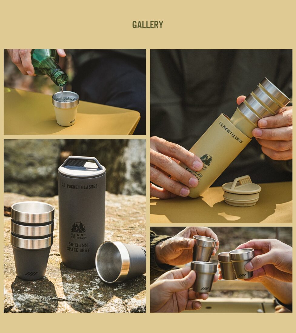 จบทุกปัญหาความยุ่งยากในการพกพาแก้วไปแคมป์ ไม่ว่าจะเป็นแก้วแตก เสียงดังจากการกระทบกัน หรือการจัดเก็บที่กินพื้นที่ CC. POCKET GLASSES คือคำตอบที่สมบูรณ์แบบที่ผสานดีไซน์อันเรียบหรูเข้ากับฟังก์ชันการใช้งานที่เหนือกว่า มาพร้อมแก้วสแตนเลส 4 ใบที่ซ้อนเก็บในกระบอกได้อย่างพอดีและเงียบสนิท พร้อมให้คุณและเพื่อนร่วมทริปเพลิดเพลินกับเครื่องดื่มแก้วโปรดได้ในทุกที่ ทุกเวลา