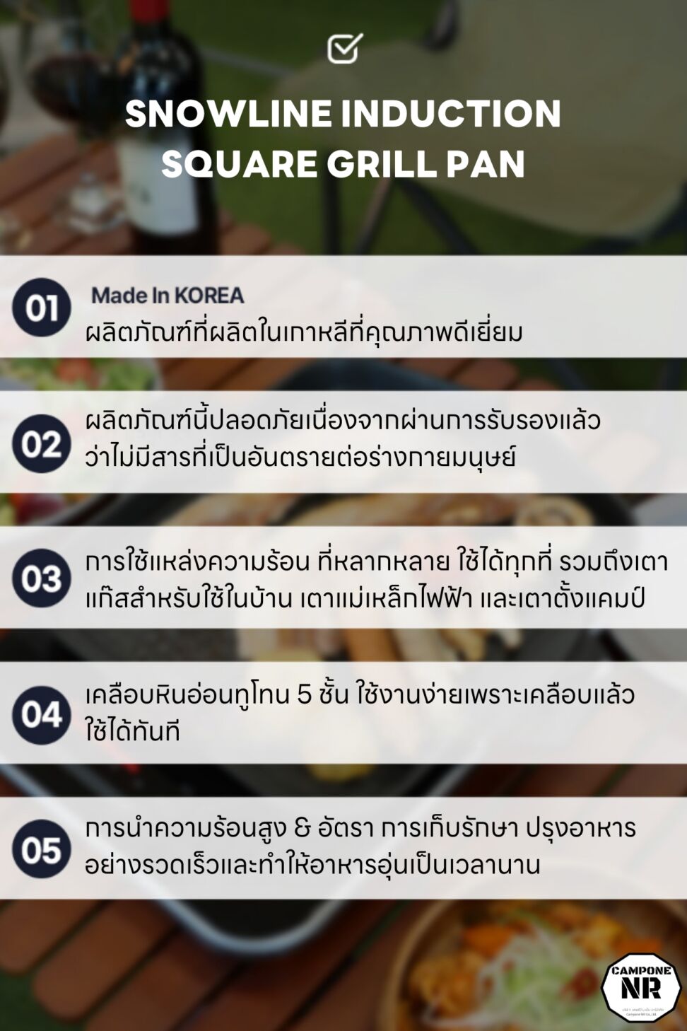 รายละเอียด : กระทะปิ้งย่างสี่เหลี่ยมตัวใหม่ล่าสุดจาก Snowline แบรนด์อุปกรณ์แคมป์ปิ้ง outdoor จากประเทศเกาหลี ที่สามารถใช้ได้กับเตาแทบทุกประเภท ผิวกระทะลายรังผึ้ง ถูกฝังอยู่บนผนังกระทะผ่านกระบวนการแกะสลักด้วยเทคโนโลยี แก้ปัญหาเรื่องการระบายน้ำมันและอาหารติดกระทะได้อย่างมีประสิทธิภาพ พร้อมเคลือบผิวมาถึง5ชั้น การเคลือบหินอ่อนเรซินฟลูออรีนแบบไม่ติด 5 ชั้นช่วยให้ใช้งานได้ทันที และทำความสะอาดง่ายเนื่องจากอาหารไม่ติดกระทะ