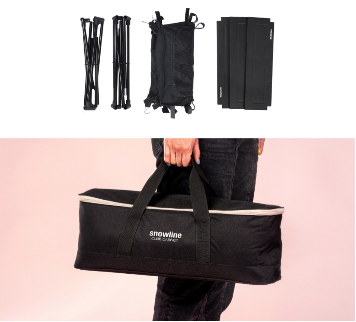 ชั้นวางอุปกรณ์ทำอาหารพับเก็บได้ มีประตูเปิดปิดกันแมลง ผ้าใบกันน้ำ น้ำหนักเบาพกพาสะดวก เป็นโต๊ะในตัวและยังมีช่องใส่กระติกน้ำอีกด้วย รับน้ำหนักได้ 15 กิโลกรัม
