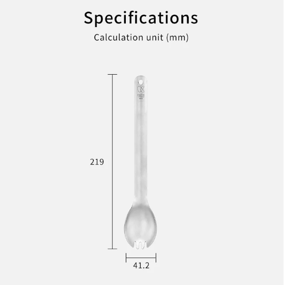 รายละเอียด : ช้อนส้อม Spork แบบด้ามยาว ผลิตจากไทเทเนียม Keith รหัส Ti5319 เป็นช้อนอเนกประสงค์ที่สามารถใช้เป็นช้อน ส้อม ได้ในตัวเดียวกัน ด้วยความยาว 22 cm ทำให้สามารถใช้คนในหม้อได้สะดวก ทั้งยังออกแบบให้มีความโค้งเพื่อให้สะดวกในการตักน้ำแกง น้ำหนักเบาเพียง 20 g