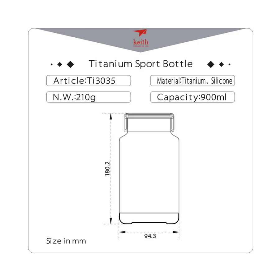 รายละเอียด : ขวดน้ำไทเทเนียม Keith Ti3035 ขนาด 900 ml ผลิตจากไทเทเนียมบริสุทธิ์ 99.96% แข็งแรงทนทานและน้ำหนักเบาเพียง 210 g ปราศจากการเคลือบสารใดๆทั้งสิ้น ปลอดภัย ไร้สารพิษ ไร้กลิ่น ไม่ส่งผลต่อรสชาติ ทนต่อการกัดกร่อนและยังยับยั้งการเจริญเติบโตของเชื้อแบคทีเรีย ขวดน้ำไทเทเนียม Keith สามารถบรรจุได้ทั้งน้ำร้อนและน้ำเย็น ซึ่งทนต่อความร้อนอุณหภูมิสูงถึง 1600 องศาเซลเซียส ไม่ทำให้เสียรูปทรง และไม่เปราะง่ายเมื่ออยู่ในอุณหภูมิเย็นจัด ด้วยรูปแบบที่หรูหราและใช้งานง่าย ขวดน้ำไทเทเนียม Keith จึงเหมาะสำหรับการพกพาไปใช้ในชีวิตประจำวันและกิจกรรมกลางแจ้ง