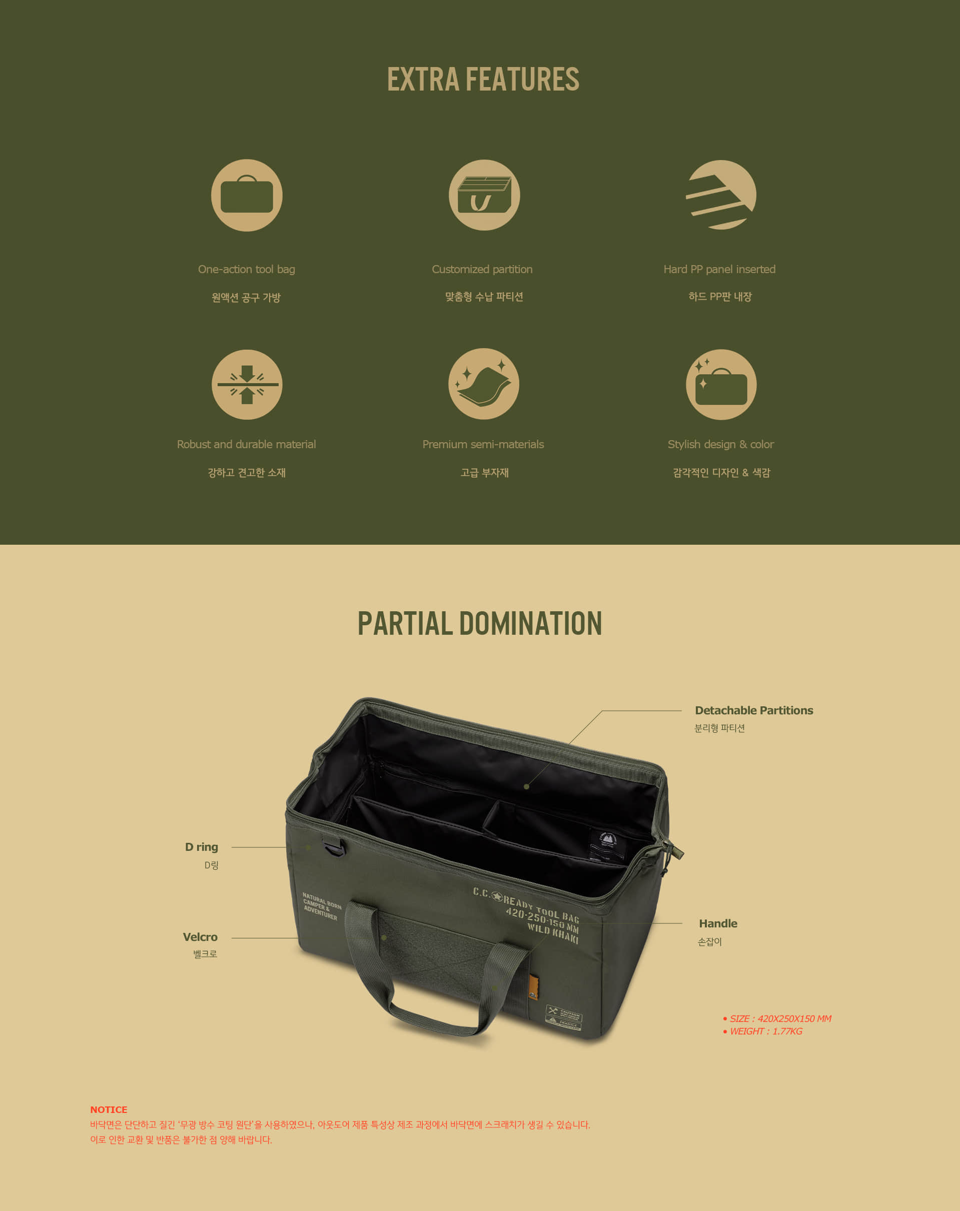 รายละเอียด : เป็นกระเป๋าแบบ one-action สำหรับใส่อุปกรณ์หรือเครื่องมือโดยเฉพาะ ซึ่งสามารถมองเห็นเครื่องมือทั้งหมดได้อย่างรวดเร็วเมื่อเปิดและกางซิปออก ภายในแบ่งเป็นสี่ช่อง คุณสามารถแยกกระเป๋ายาว 30-40 ซม. และกระเป๋าสั้น 20 ซม. ใส่อุปกรณ์เสริม เช่น คาราบิเนอร์ ถุงมือ และเชือก นอกจากนี้ ยังมีการใส่แผ่น PP แบบแข็ง เพื่อให้กระเป๋าอยู่ทรง และสิ่งของภายในได้รับการปกป้องอย่างแน่นหนาและปลอดภัย