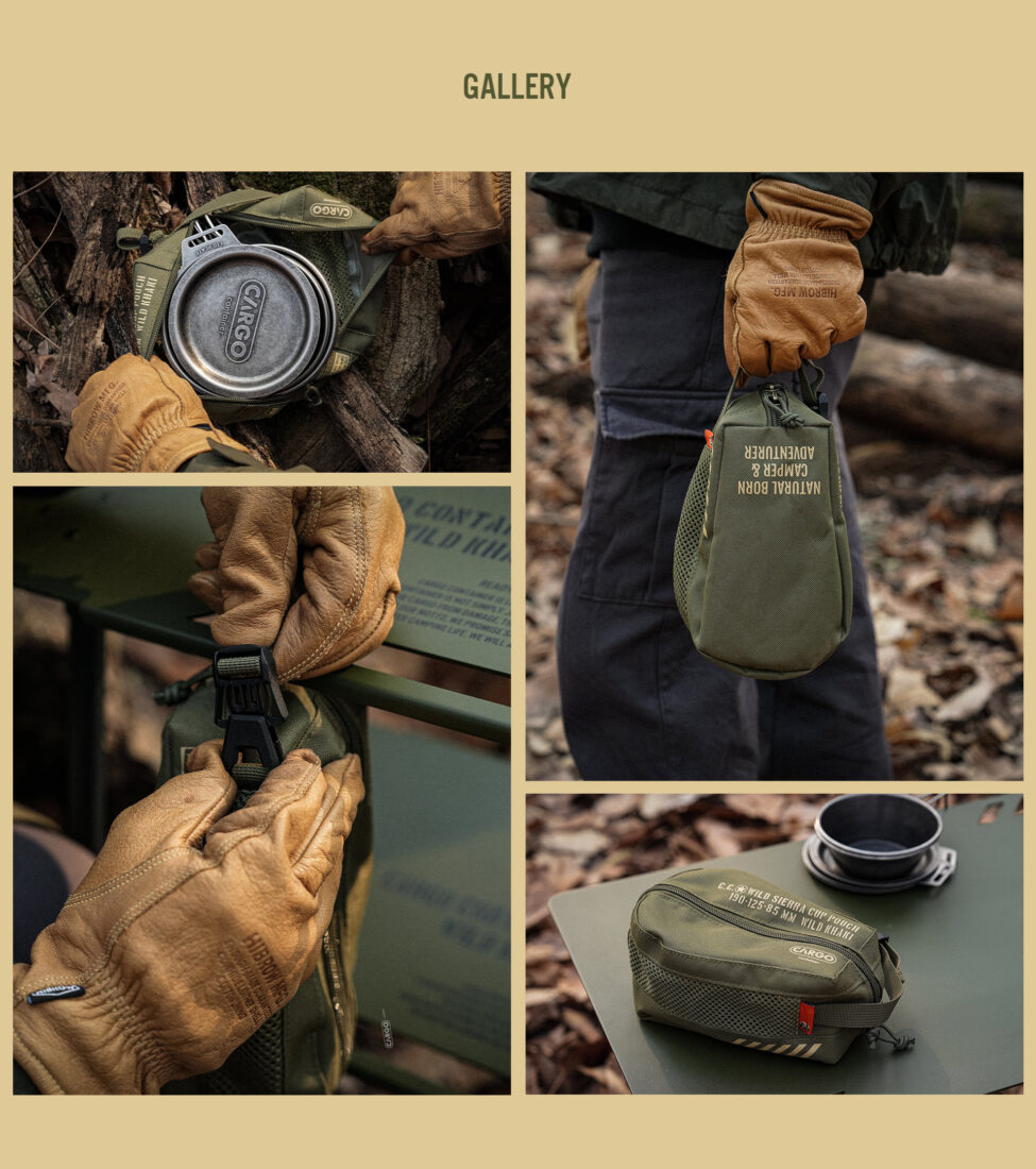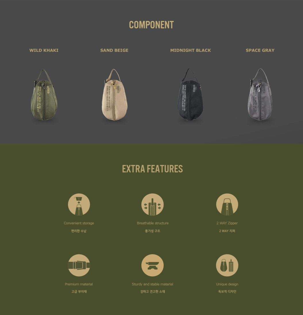 ผลิตจากวัสดุ Polyester Oxford 600D ที่ทนทานต่อแรงกระแทกและการสึกหรอ ภายในบุด้วยวัสดุกันน้ำ ป้องกันการปนเปื้อน มาพร้อมโครงสร้างตาข่ายระบายอากาศสองด้าน ช่วยป้องกันความชื้นและกลิ่นอับ เพื่อการจัดเก็บที่ถูกสุขลักษณะ สายคล้องมือปรับความยาวได้ สามารถแขวนกับอุปกรณ์แคมป์ปิ้งได้หลากหลาย