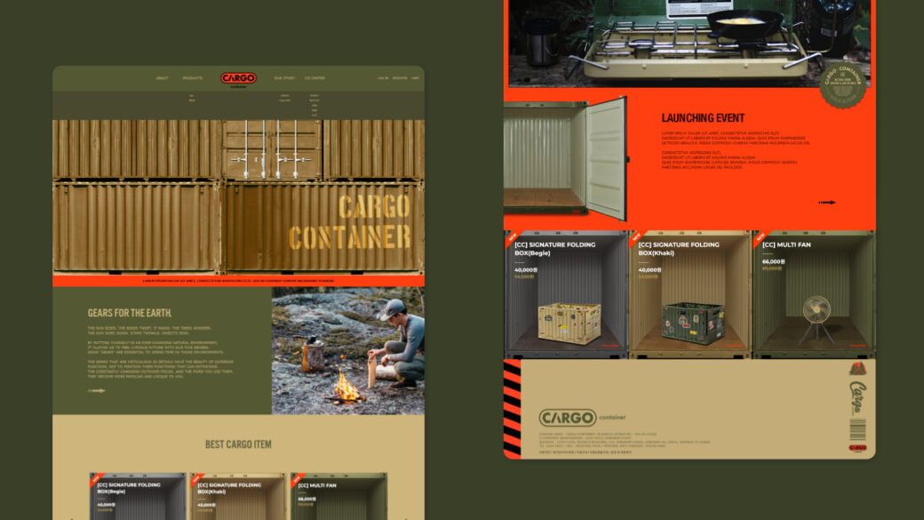 “CARGO CONTAINER” เป็นแบรนด์แคมป์ปิ้งสำหรับชาวแคมป์ที่ต้องการหลีกหนีจากความซับซ้อนและความเร่งรีบของชีวิตในเมือง และออกเดินทางสู่ธรรมชาติด้วยตนเอง เช่นเดียวกับบางสิ่งบางอย่างที่ได้รับการบรรจุและจัดส่งอย่างปลอดภัยในกล่องคอนเทนเนอร์ขนาดใหญ่ ชื่อแบรนด์ “Cargo Container” ก็หมายถึงการจัดหาผลิตภัณฑ์ที่สำคัญที่สุดให้กับผู้ที่กำลังมองหาประสบการณ์การตั้งแคมป์ที่ไม่เหมือนใคร นอกจากนี้ ด้วยการผสมผสานสุนทรียภาพทางการทหาร คล้ายกับ “การอำพราง” เราได้สร้างภาพลักษณ์ของแบรนด์ที่มีเอกลักษณ์เฉพาะตัว ซึ่งช่วยให้ความงามอันบริสุทธิ์ของผืนป่าผสมผสานกับเอกลักษณ์ของ Cargo Container ได้อย่างลงตัว
