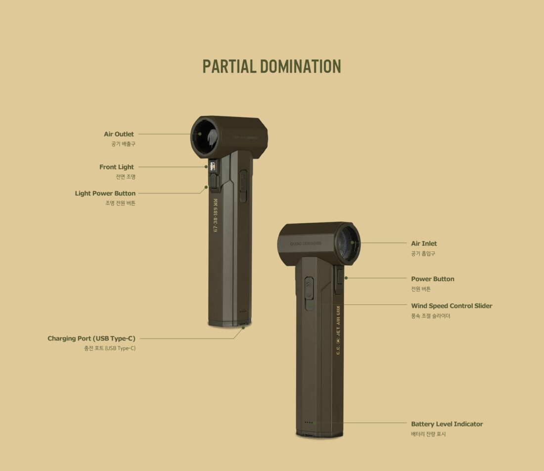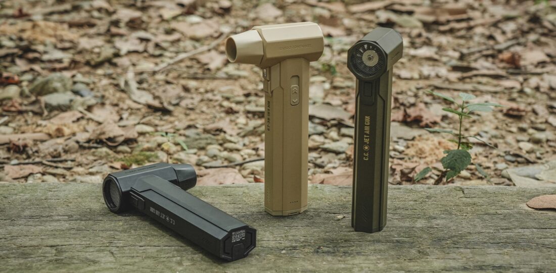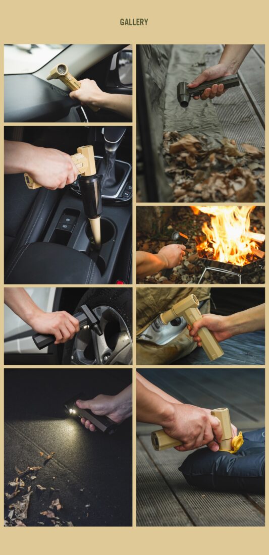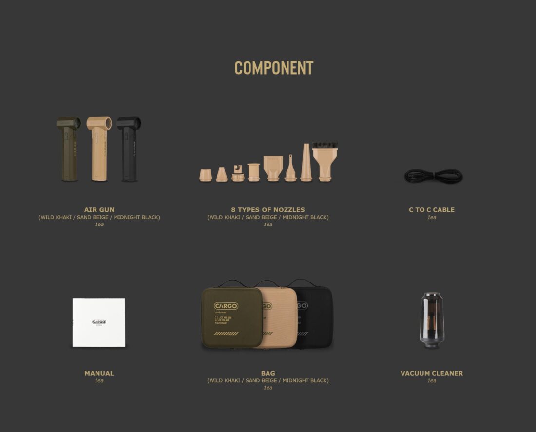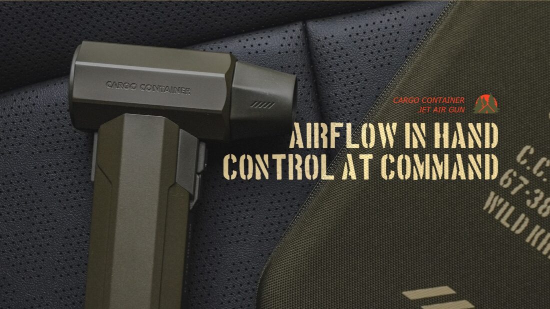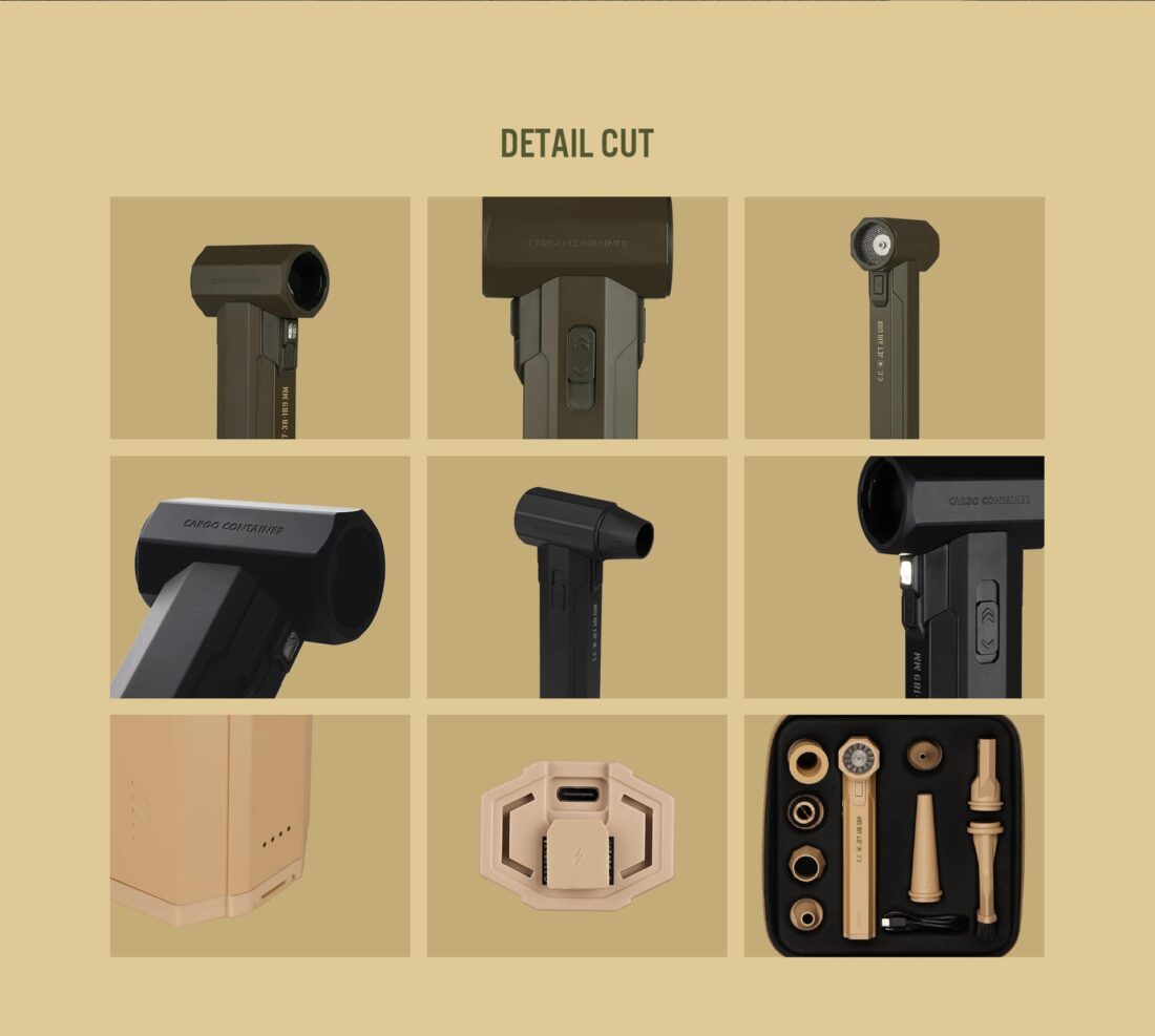 CC JET AIR GUN ปฏิวัติวงการอุปกรณ์แคมป์ปิ้งด้วยเครื่องเป่าลมพกพาประสิทธิภาพสูงจาก Cargo Container ที่มาพร้อมดีไซน์ Tactical สุดเท่และวัสดุเกรดพรีเมียม โดดเด่นด้วยพลังลมที่รุนแรงจากมอเตอร์ BLDC ความเร็วสูงถึง 130,000 RPM (รอบต่อนาที) ทำให้สามารถใช้งานได้หลากหลายสถานการณ์ ไม่ว่าจะเป็นการเป่าฝุ่นทำความสะอาดอุปกรณ์แคมป์, ช่วยจุดไฟเตาถ่าน, เป่าลมที่นอนเป่าลม, หรือแม้แต่ใช้เป่าผมและทำความสะอาดรถยนต์ ตัวเครื่องทำจากอลูมิเนียมอัลลอยด์ให้ความรู้สึกแข็งแรง ทนทาน และหรูหรา มาพร้อมหัวเปลี่ยน (Nozzle) ถึง 8 แบบ เพื่อตอบโจทย์ทุกการใช้งานได้อย่างครอบคลุมที่สุด