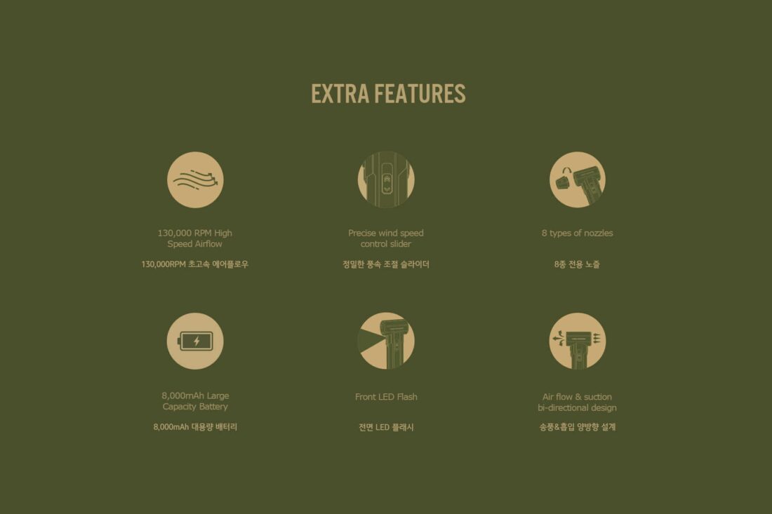 พลังลมเหนือชั้นด้วยมอเตอร์ 130,000 RPM หัวใจสำคัญคือมอเตอร์ BLDC ประสิทธิภาพสูงที่ให้กำลังแรงถึง 170W สร้างกระแสลมที่รุนแรงและต่อเนื่อง ช่วยขจัดฝุ่นและสิ่งสกปรกได้อย่างหมดจด หรือใช้สูบลมเข้าอุปกรณ์ต่างๆ ได้อย่างรวดเร็ว (สามารถใช้เป็นที่สูบลมเข้าและดูดลมออกได้)