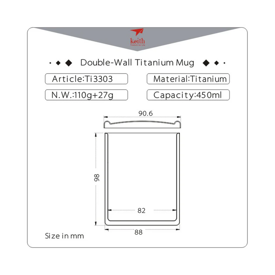 ผลิตจากไทเทเนียมความบริสุทธิ์ 99.9% จึงมีคุณสมบัติที่แข็งแรงทนทาน ไม่มีสารพิษ ปลอดภัยในการใช้ ไม่เป็นสนิม ทนการกัดกร่อน และทนความร้อนได้สูงถึง 1600 องศาเซลเซียส จึงไม่เสียรูปจากการโดนความร้อน ยิ่งอยู่ในที่เย็นมาก ไทเทเนียมจะมีความแข็งแรงมากยิ่งขึ้นได้ถึงระดับความเย็น – 253 องศาเซลเซียส จึงไม่เเปราะเวลาโดนความเย็นมากๆเหมือนวัสดุอื่น ขนาดเล็กพกพาง่าย ที่ผิวขัดทราย ให้ความหรูหราของแก้วน้ำไทเทเนียม เหมาะสำหรับเป็นแก้วน้ำพกติดตัวในการเดินทางทุกรูปแบบ