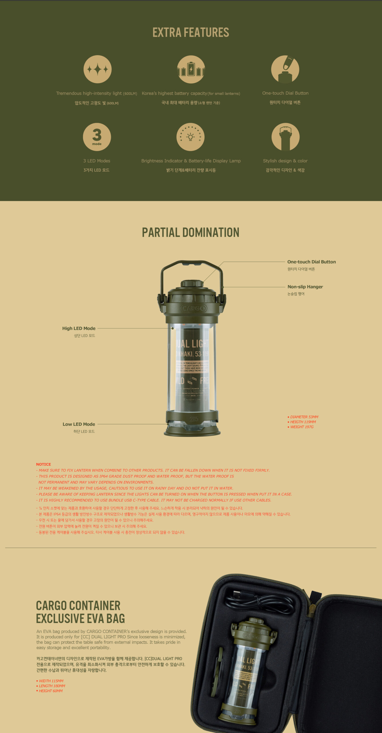 รายละเอียด : DUAL LIGHT PRO ประสบความสำเร็จในการสร้างไฟขนาดเล็กที่สว่างมากที่สุด ให้ความสว่างมากถึง 600 ลูเมน นอกจากนี้ยังมี LOW LED MODE ออกแบบเพื่อให้มองเห็นได้ชัดเจนแม้กระทั่งพื้นที่ด้านล่างของโคมไฟ วัสดุทำจากอลูมิเนียม แข็งแรงทนทาน โป๊ะทำจาก โพลีคาร์บอเนตซึ่งมีความทนทานมากกว่ากระจกนิรภัยถึง 150 เท่า และนอกจากนี้ ยังสามารถควบคุมจากระยะไกล โดยดาวน์โหลดแอปเฉพาะสำหรับ CARGO CONTAINER (IOS, Android) และเชื่อมต่อผ่านบลูทูธ และยังสามารถดูสถานะแบตเตอรี่ผ่านแอพได้อีกเช่นกัน