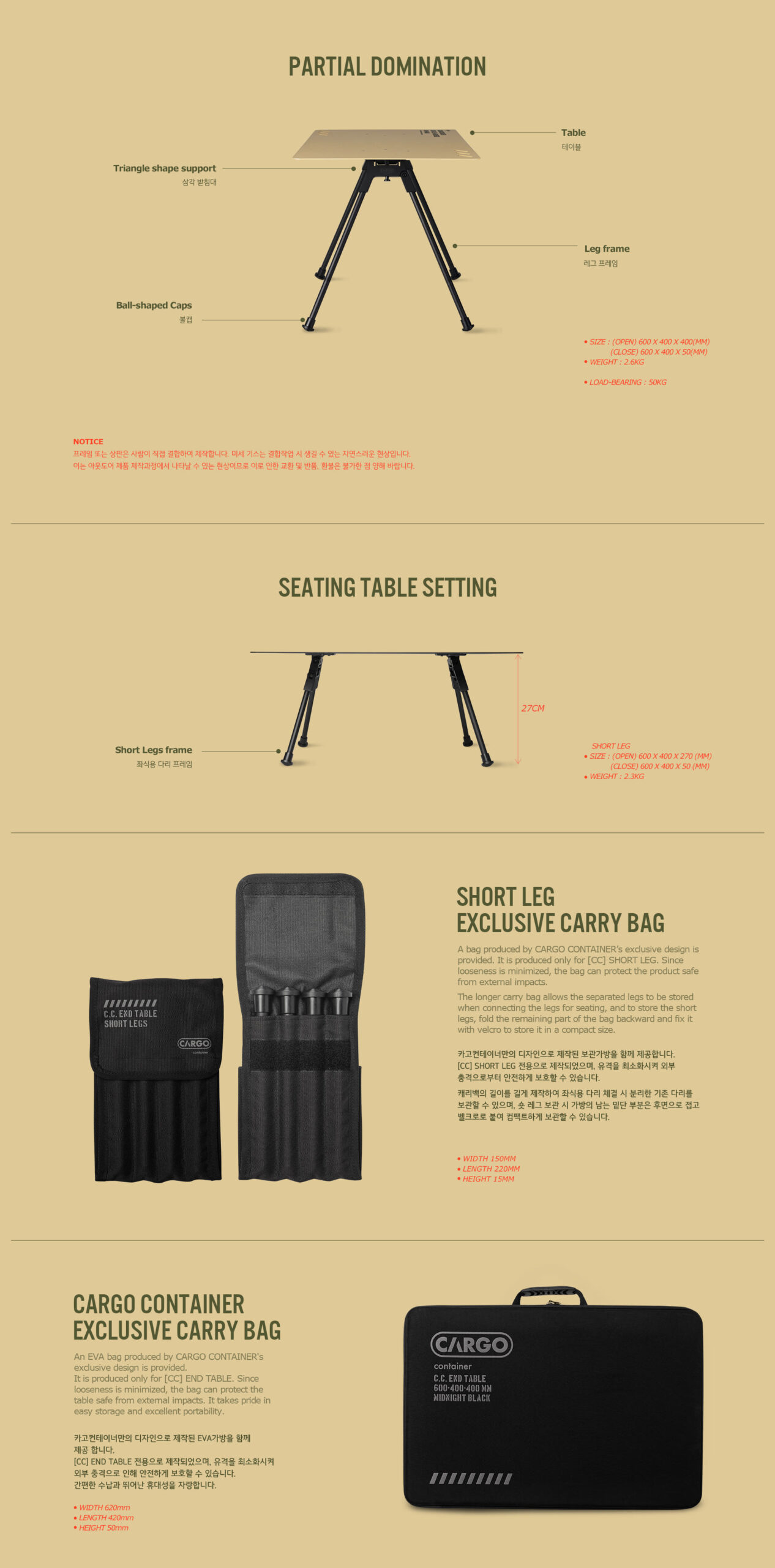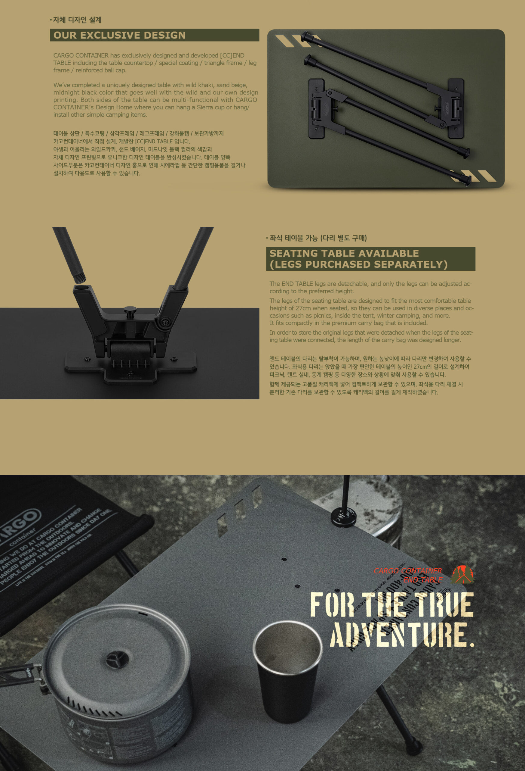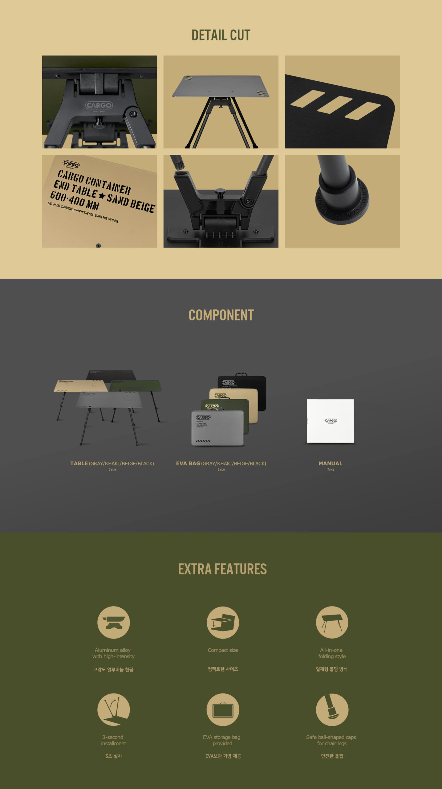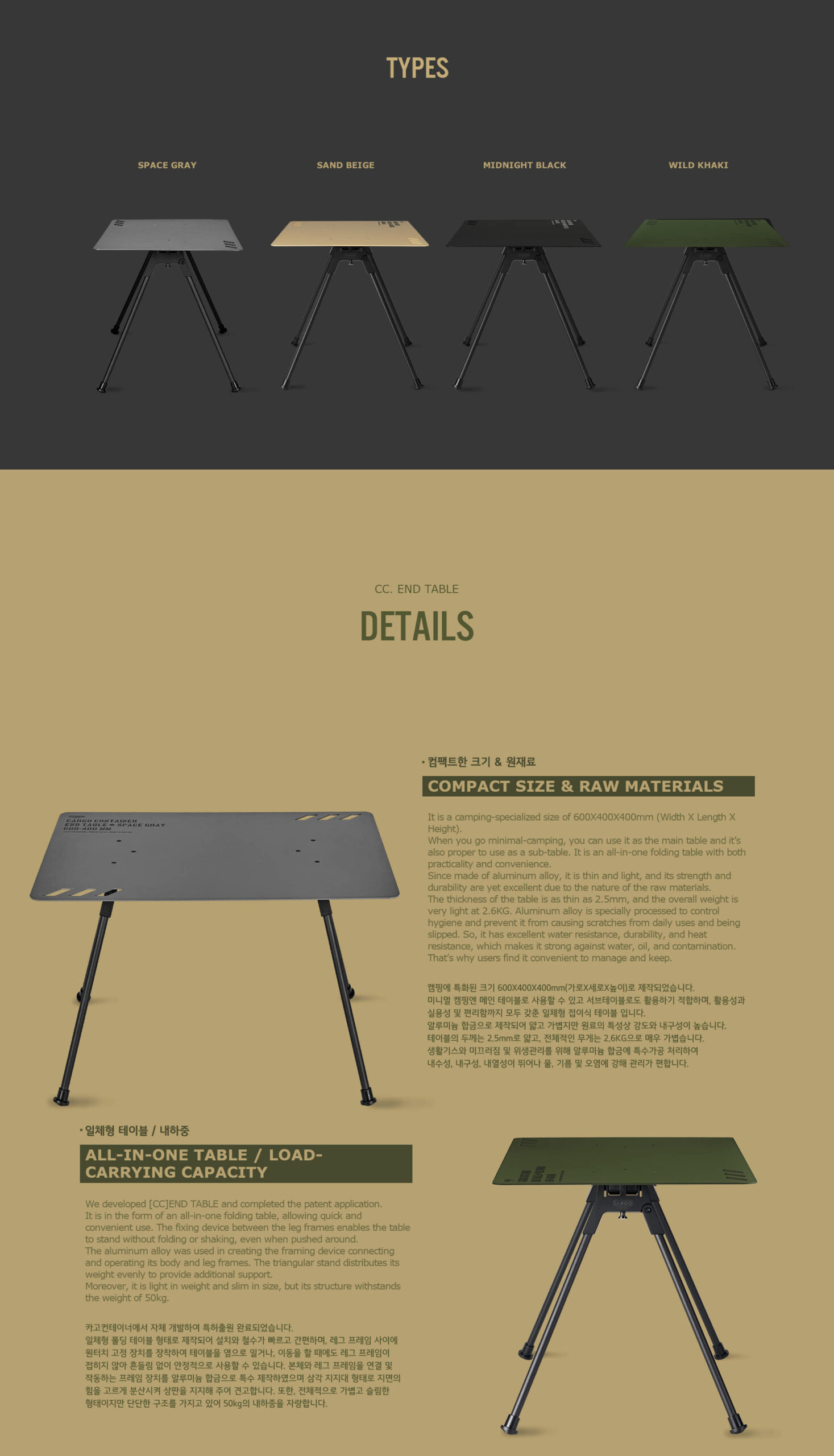 รายละเอียด : End Table โต๊ะแคมป์ปิ้งจากแบรนด์ Cargo Container ประเทศเกาหลี วัสดุโต๊ะทำจาก อลูมิเนียม อัลลอยด์ คุณภาพสูง ที่มีความบางเพียง 2.5 มม. แต่รับน้ำหนักได้มากถึง 50 กิโลกรัม กางง่าย ไม่ต้องติดตั้งหรือถอดอุปกรณ์เสริมอื่นๆ ใช้งานง่ายเพียงแค่กางขาโต๊ะออก มาพร้อมกระเป๋าเก็บที่ทำจากวัสดุ EVA ช่วยป้องกันการกระทบจากภายนอกและเคลื่อนย้ายได้ง่าย