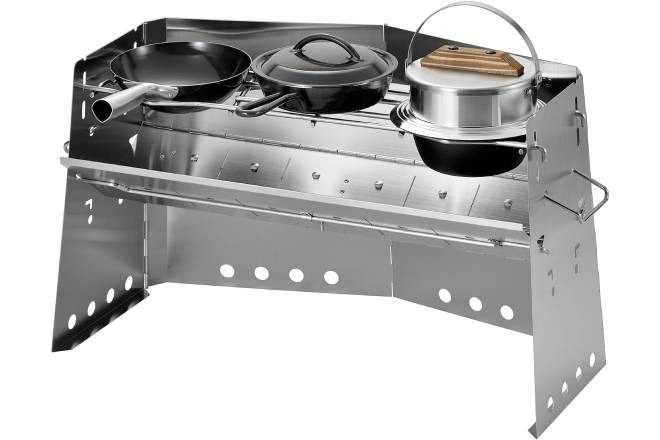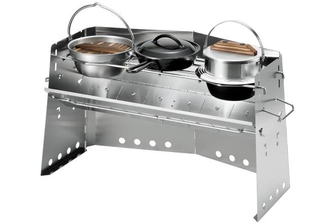 จุดเด่นยังคงเหมือนรุ่นน้อง คือสามารถ “ถอดชิ้นส่วนตะแกรงออก” เพื่อฝังหม้อก้นลึกให้จมลงไปใกล้เปลวไฟได้ แต่สิ่งที่พิเศษกว่าคือ เมื่อฝังหม้อที่ด้านซ้ายและขวาแล้ว “พื้นที่ตรงกลาง” ยังเหลือตะแกรงเหล็กให้วางหม้อเล็กๆ, กาน้ำ, หรือกระทะ Skillet 7 นิ้ว ได้อีก 1 ใบ ทำให้คุณทำอาหารได้ถึง 3 เมนูในเวลาเดียวกัน!