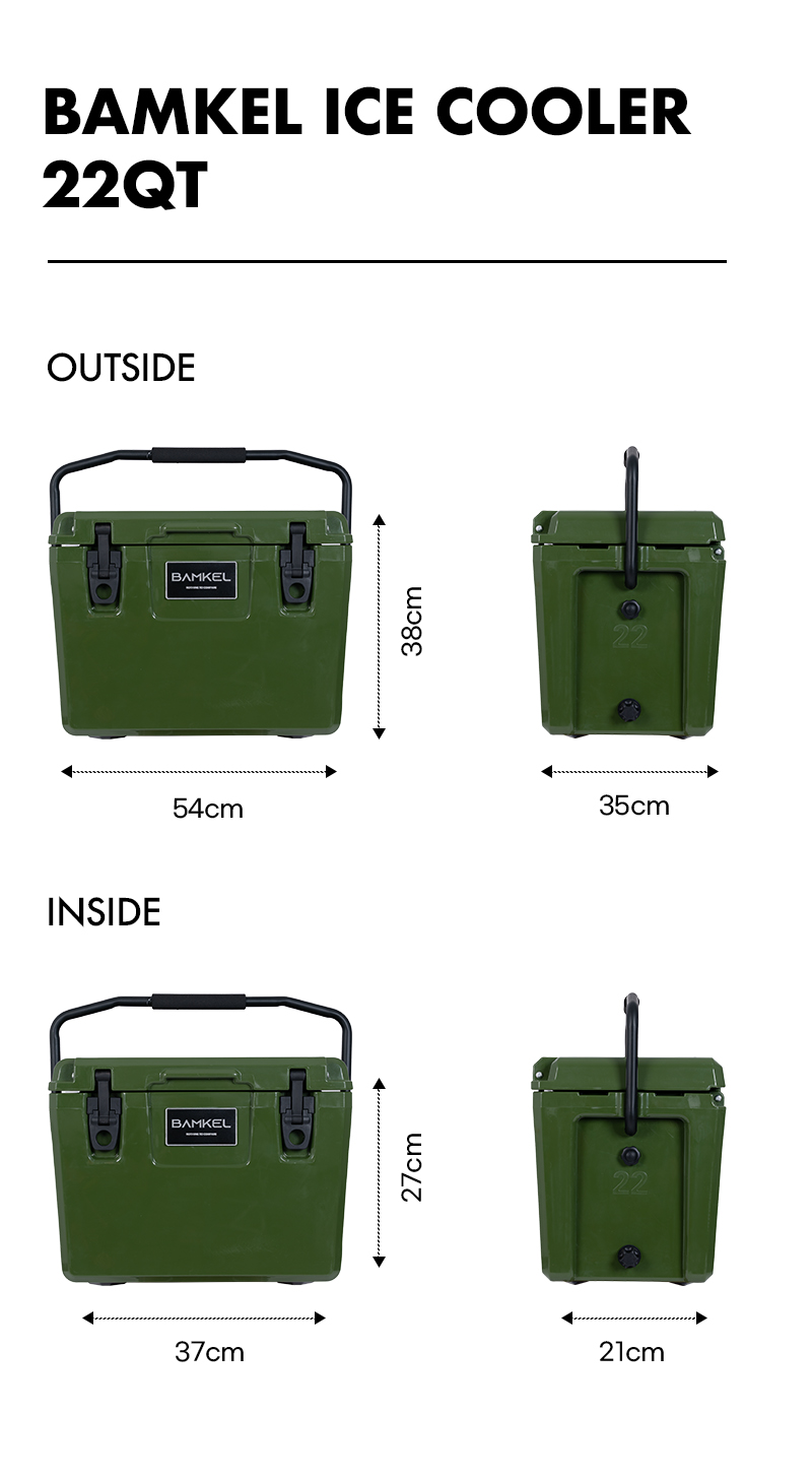 BAMKEL Modern 22QT กระติกน้ำแข็งขนาด 22QT แข็งแรง ทนทาน เก็บความเย็นได้นานถึง 120 ชั่วโมง กระติก Bamkel ผลิตขึ้นด้วยกระบวนการ Rotomold กระบวนการนี้สร้างการออกแบบชิ้นเดียวที่ทนทานโดยไม่มีตะเข็บหรือรอยต่อ ซึ่งทำให้การผลิตแบบ rotomold ทนทานต่อแรงกระแทก รังสียูวี อุณหภูมิที่รุนแรง และยังเป็นที่รู้จักในด้านคุณสมบัติการเป็นฉนวนที่ยอดเยี่ยม ซึ่งสามารถเก็บน้ำแข็งและเครื่องดื่มให้เย็นได้เป็นเวลานาน มาพร้อมตะกร้า และฉากกั้น ใช้งานได้สะดวกยิ่งขึ้น