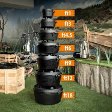 Dutch oven หม้อทำอาหารเหล็กหล่อ ft6 ขนาดสำหรับ จำนวนคน 4-8 คน ความจุสูงสุดของหม้อ 5.5 ลิตร และฝา 1.5 ลิตร เหมาะสำหรับการทำอาหารบนกองไฟ ปรุงอาหารได้ทั้งประเภทผักและเนื้อสัตว์ ด้วยคุณสมบัติพิเศษน้ำภายในอาหารจะไม่ระเหยออกไปมากเหมือนหม้อทั่วไปทำให้อาหารมีความชุ่มชื้นกรอบนอกนุ่มใน ฝาปิดออกแบบมาเป็นพิเศษที่สามารถใช้เป็นกระทะหรือแผ่นปิ้งย่าง