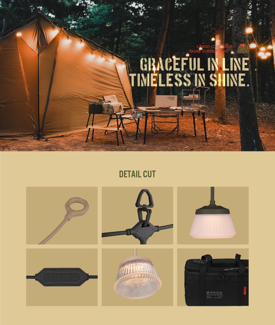 CC SHINE STRING LIGHT 7 ไฟประดับระดับพรีเมียมจาก Cargo Container ที่ถูกออกแบบมาเพื่อเติมเต็มบรรยากาศการแคมป์ปิ้งให้สมบูรณ์แบบที่สุด ด้วยดีไซน์สไตล์ Military Industrial อันเป็นเอกลักษณ์ ผสานเทคโนโลยีแสงสว่างทรงพลังที่มีความสว่างสูงสุดถึง 7,500 ลูเมน (เมื่อเปิดสุด) พร้อมหลอดไฟ LED 7 ดวงที่ให้แสงนวลตา ไม่เพียงแค่สร้างบรรยากาศ แต่ยังสามารถใช้เป็นไฟหลัก (Main Light) ได้อย่างมีประสิทธิภาพ มาพร้อมฟังก์ชันอัจฉริยะที่ควบคุมได้ทั้งผ่านคอนโทรลเลอร์และแอปพลิเคชัน ทำให้คุณปรับเปลี่ยนบรรยากาศในแคมป์ได้ดั่งใจเพียงปลายนิ้วสัมผัส