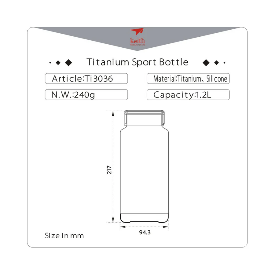 รายละเอียด : ขวดน้ำไทเทเนียม Keith Ti3036 ขนาด 1200 ml ผลิตจากไทเทเนียมบริสุทธิ์ 99.96% แข็งแรงทนทานและน้ำหนักเบาเพียง 240 g ปราศจากการเคลือบสารใดๆทั้งสิ้น ปลอดภัย ไร้สารพิษ ไร้กลิ่น ไม่ส่งผลต่อรสชาติ ทนต่อการกัดกร่อนและยังยับยั้งการเจริญเติบโตของเชื้อแบคทีเรีย ขวดน้ำไทเทเนียม Keith สามารถบรรจุได้ทั้งน้ำร้อนและน้ำเย็น ซึ่งทนต่อความร้อนอุณหภูมิสูงถึง 1600 องศาเซลเซียส ไม่ทำให้เสียรูปทรง และไม่เปราะง่ายเมื่ออยู่ในอุณหภูมิเย็นจัด ด้วยรูปแบบที่หรูหราและใช้งานง่าย ขวดน้ำไทเทเนียม Keith จึงเหมาะสำหรับการพกพาไปใช้ในชีวิตประจำวันและกิจกรรมกลางแจ้ง
