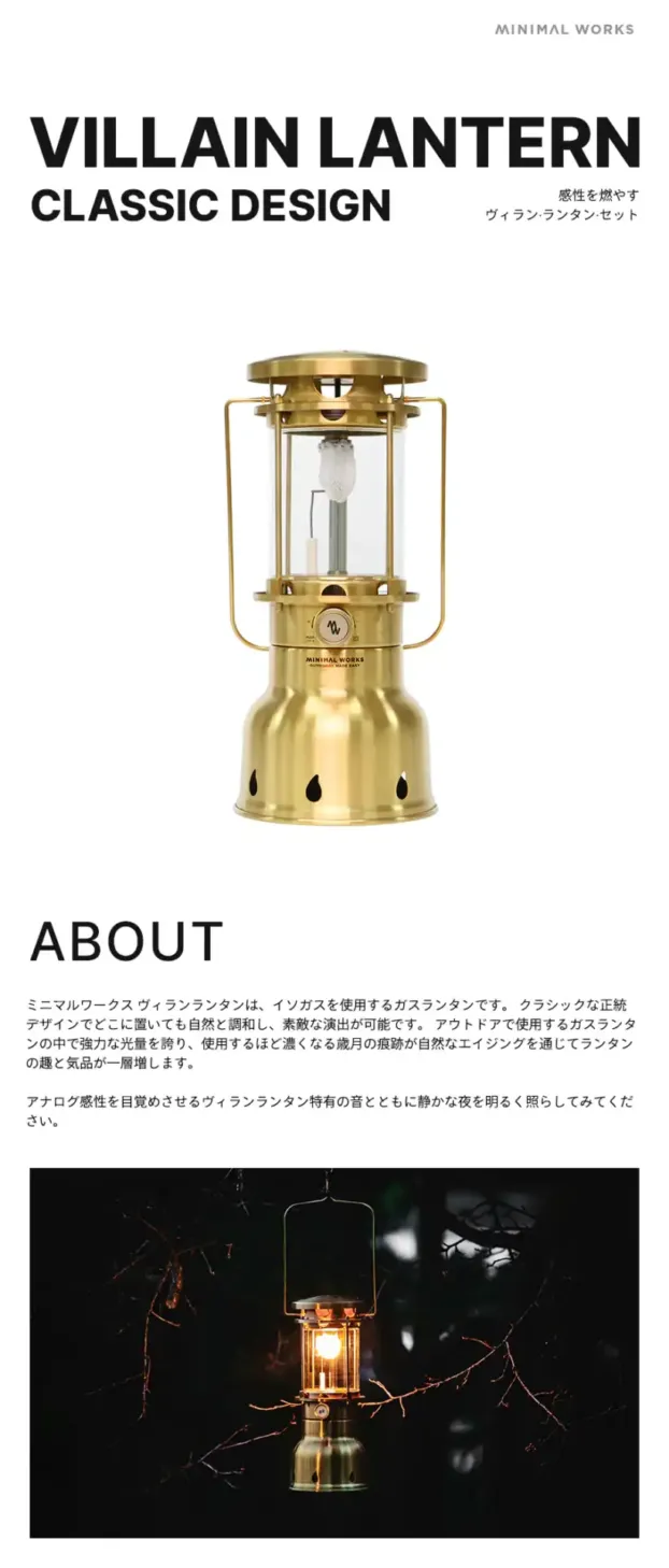 ตะเกียงดวงใหญ่รุ่นใหม่จากค่าย Minimal Works รูปทรงสุดคลาสสิคแต่แอบแฝงระบบของตะเกียงแก๊สยุคใหม่ไว้ด้วยกันได้อย่างลงด้วย ใช้งานง่ายกับถังแก๊สซาลาเปา มีระบบแม็กนีโตช่วยจุดในตัว และยังมีเคสกันกระแทกมาให้ในเซ็ท เพื่อเพิ่มความปลอดภัยในการเคลื่อนย้าย ให้ความสว่างถึง 210w แสงสวยงามช่วยเพิ่มบรรยากาศในแคมป์ให้ดูอบอุ่น
