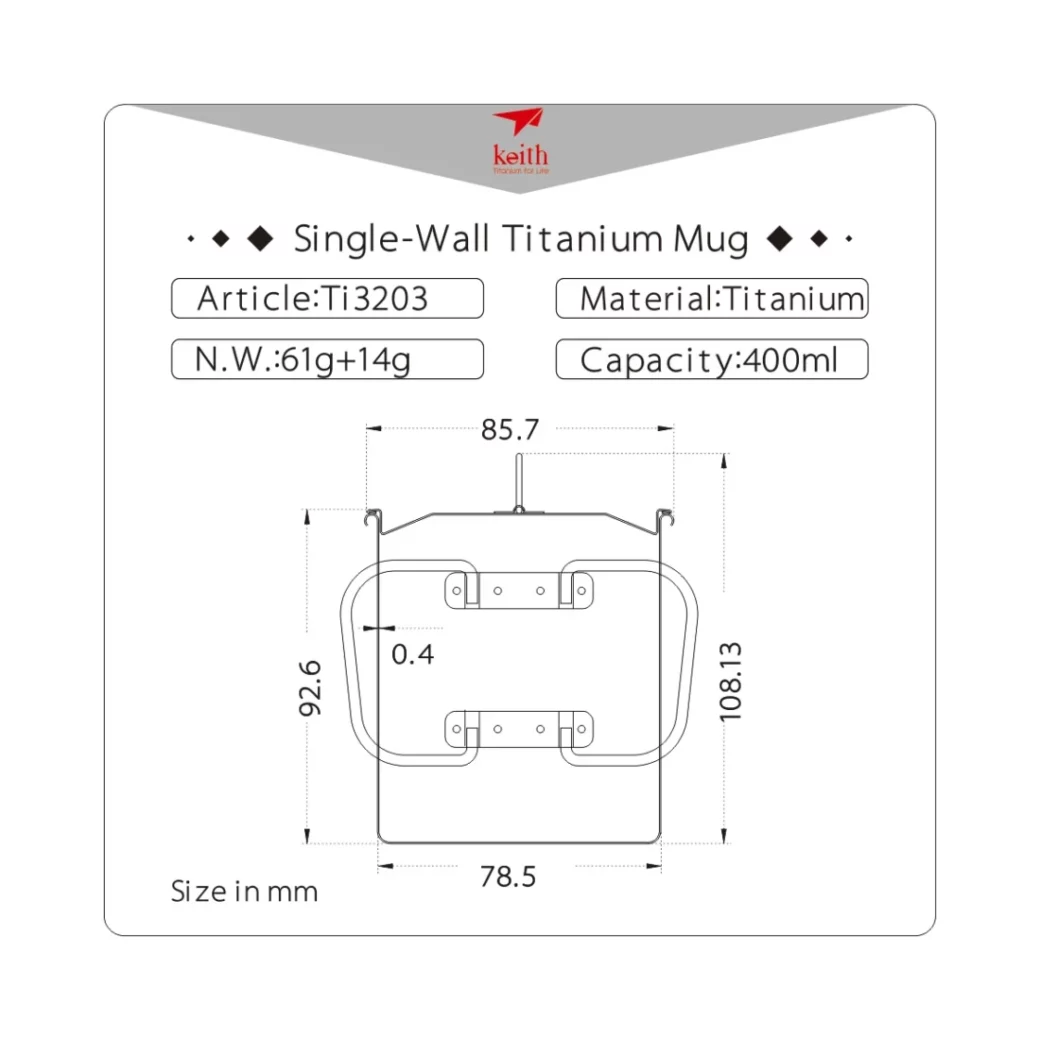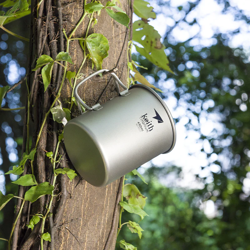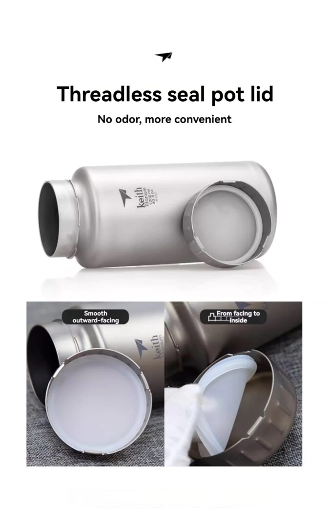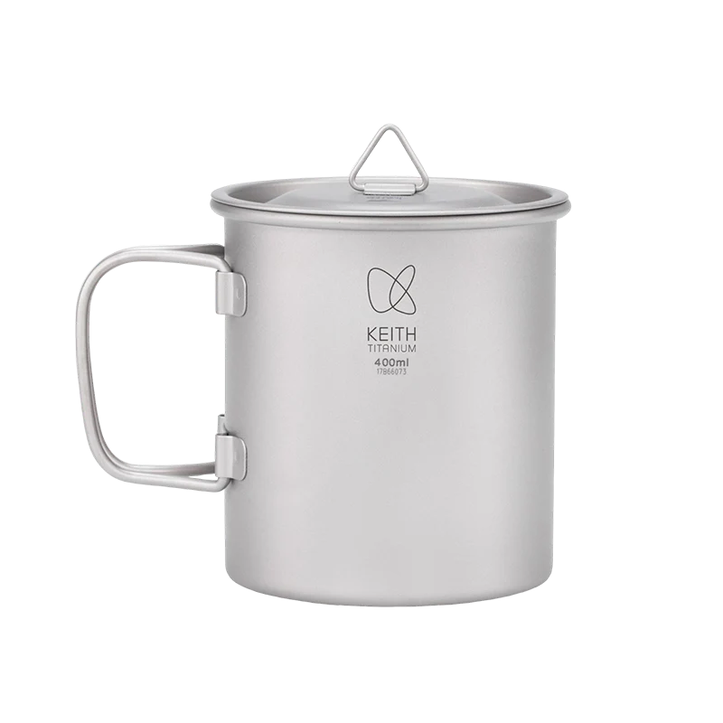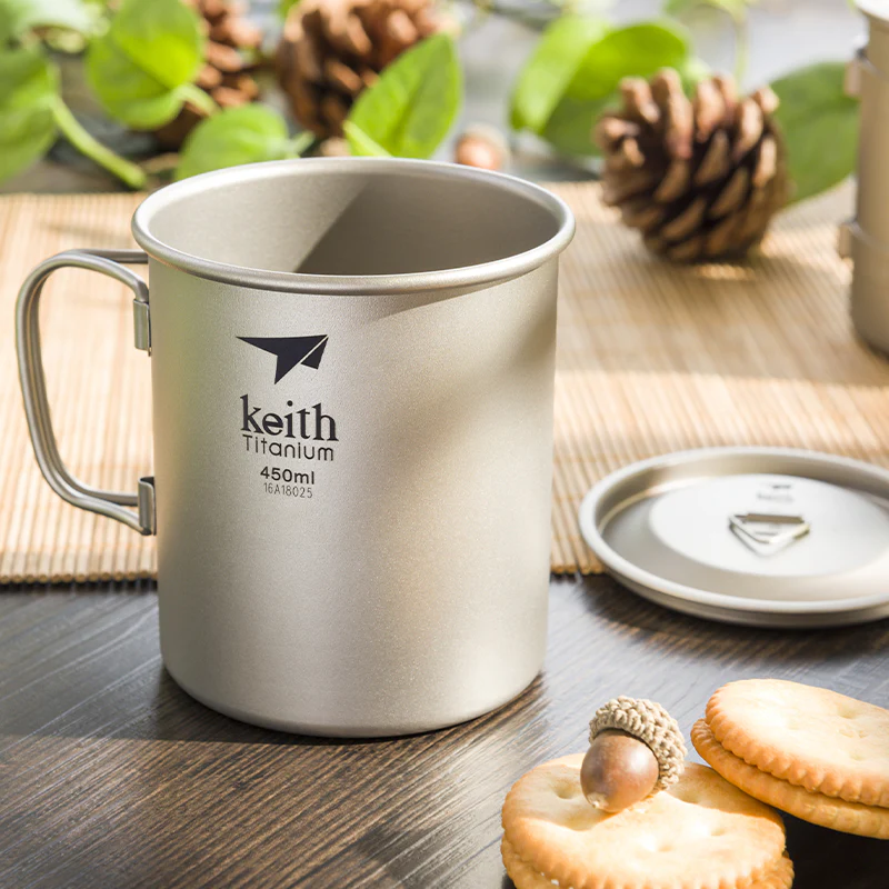 แก้วไทเทเนียม จาก Keith พร้อมฝาปิด ผลิตจากโลหะไทเทเนียม น้ำหนักเบา หูจับผลิตจาก stainless steel ช่วยให้สามารถจับแก้วได้แม้จะบรรจุของร้อนอยู่ เหมาะสำหรับเป็นอุปกรณ์พกพาระหว่างการเดินทาง ผลิตจากไทเทเนียมความบริสุทธิ์ 99.9% จึงมีคุณสมบัติที่แข็งแรงทนทาน ไม่มีสารพิษ ปลอดภัยในการใช้ ไม่เป็นสนิม ทนการกัดกร่อน และทนความร้อนได้สูงถึง 1600 องศาเซลเซียส จึงไม่เสียรูปจากการโดนความร้อน ยิ่งอยู่ในที่เย็นมาก ไทเทเนียมจะมีความแข็งแรงมากยิ่งขึ้นได้ถึงระดับความเย็น – 253 องศาเซลเซียส จึงไม่เเปราะเวลาโดนความเย็นมากๆเหมือนวัสดุอื่น ขนาดเล็กพกพาง่าย ที่ผิวขัดทราย ให้ความหรูหราของแก้วน้ำไทเทเนียม เหมาะสำหรับเป็นแก้วน้ำพกติดตัวในการเดินทางทุกรูปแบบ
