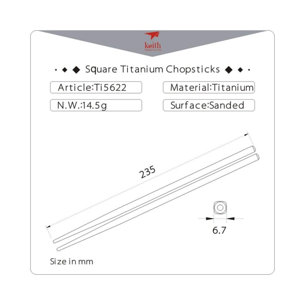 ตะเกียบไทเทเนียม ทรงเหลี่ยม เนื้อกลวง จาก Keith รุ่น Ti5622 น้ำหนักเบาเพียง 14.5g แต่แข็งแรงมาก ไม่หักง่ายเหมือนตะเกียบไม้เหมาะสำหรับพกไปใช้ในการเดินทาง