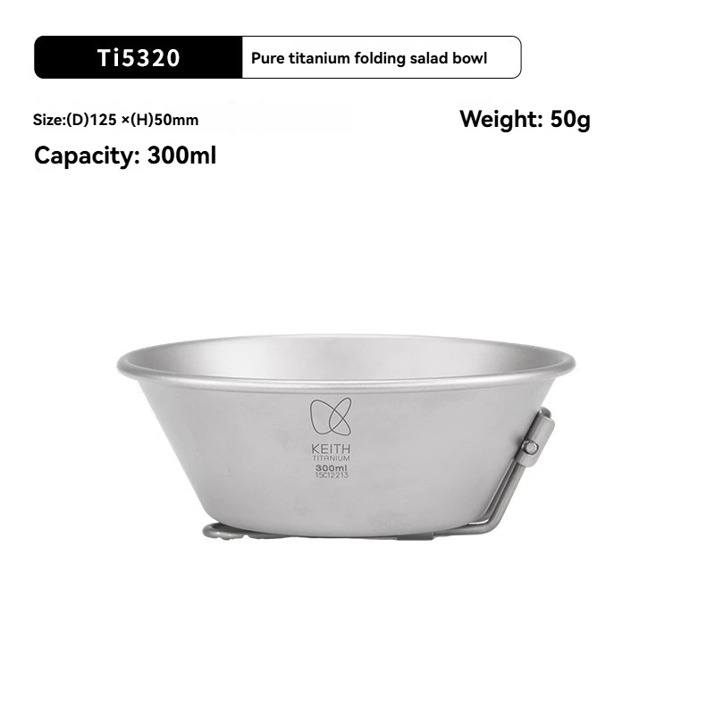 ถ้วยชามไทเทเนียม จาก Keith ขนาด 300 ml ผลิตจากโลหะไทเทเนียม น้ำหนักเบา เหมาะสำหรับเป็นอุปกรณ์พกพาสำหรับรับประทานอาหารระหว่างการเดินทาง ทรงกว้างตักอาหารง่าย จะใช้ต้มน้ำ ตวงข้าว หรือเป็นชามข้าวก็ได้ ด้ามจับพับได้เก็บซ้อนกับหม้อใบอื่นได้พอดี