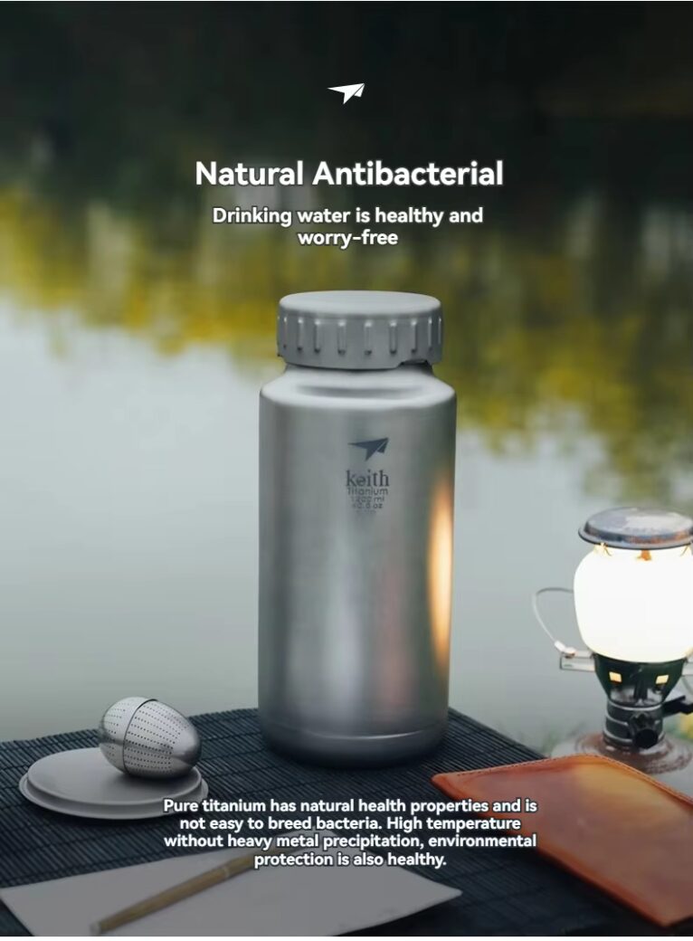 ขวดน้ำไทเทเนียม Keith Ti3036 ขนาด 1200 ml ผลิตจากไทเทเนียมบริสุทธิ์ 99.96% แข็งแรงทนทานและน้ำหนักเบาเพียง 240 g ปราศจากการเคลือบสารใดๆทั้งสิ้น ปลอดภัย ไร้สารพิษ ไร้กลิ่น ไม่ส่งผลต่อรสชาติ ทนต่อการกัดกร่อนและยังยับยั้งการเจริญเติบโตของเชื้อแบคทีเรีย ขวดน้ำไทเทเนียม Keith สามารถบรรจุได้ทั้งน้ำร้อนและน้ำเย็น ซึ่งทนต่อความร้อนอุณหภูมิสูงถึง 1600 องศาเซลเซียส ไม่ทำให้เสียรูปทรง และไม่เปราะง่ายเมื่ออยู่ในอุณหภูมิเย็นจัด ด้วยรูปแบบที่หรูหราและใช้งานง่าย ขวดน้ำไทเทเนียม Keith จึงเหมาะสำหรับการพกพาไปใช้ในชีวิตประจำวันและกิจกรรมกลางแจ้ง