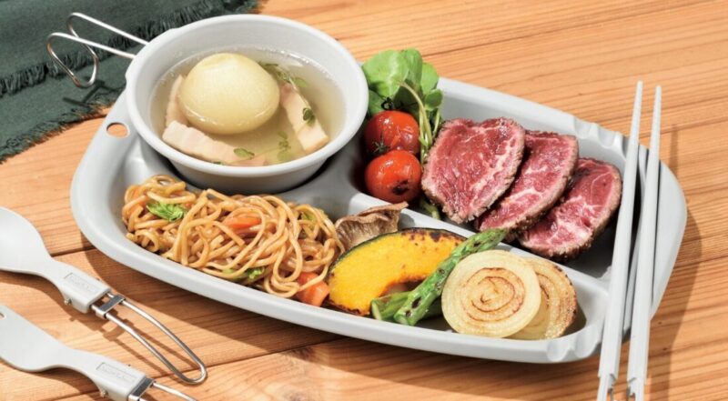 จุดเด่นของจานรุ่นนี้คือ “การออกแบบหลุมใส่แก้วและร่องวางตะเกียบ” ที่ช่วยแก้ปัญหาแก้วหกหรือหาที่วางตะเกียบไม่ได้ในแคมป์ปิ้ง คุณสามารถถือจานใบเดียวเดินไปตักอาหารพร้อมวางแก้วน้ำได้เลย สะดวกสุดๆ นอกจากนี้ยังทนความร้อนได้สูงถึง 150 องศาเซลเซียส ใส่อาหารร้อนได้สบายหายห่วง