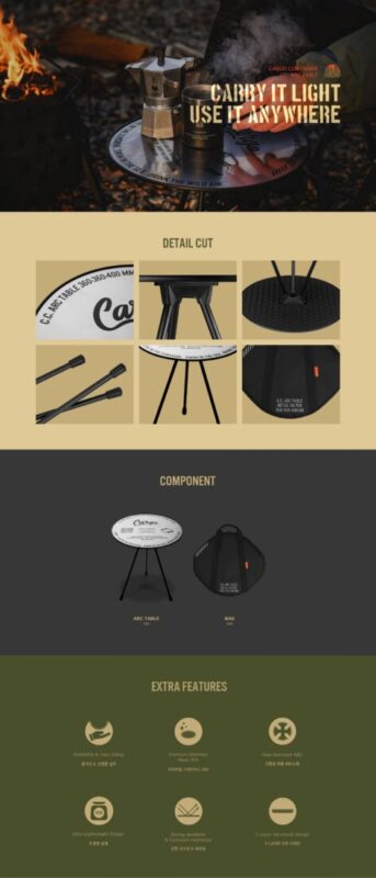 น้ำหนักเบา พกพาสะดวก: ตัวโต๊ะมีน้ำหนักไม่ถึง 1 กิโลกรัม มาพร้อมรูปแบบการจัดเก็บที่แบนราบ (Flat Fold) ประหยัดพื้นที่ในรถ หรือกระเป๋าใส่อุปกรณ์แคมป์ปิ้ง