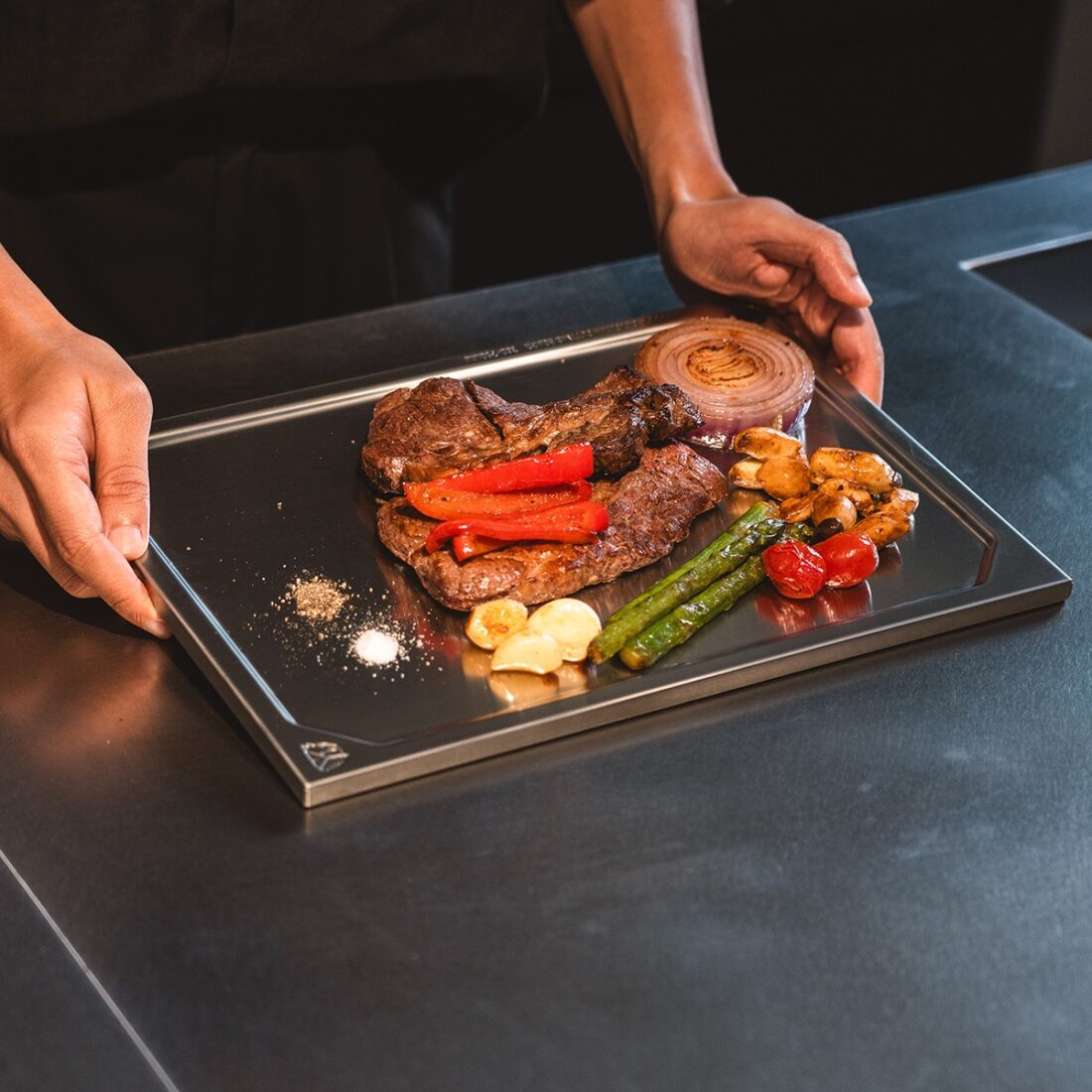 • 2-in-1 ฟังก์ชัน (Cutting Board & Plate): ดีไซน์สวยงาม เรียบหรู จนสามารถประยุกต์ใช้เป็นถาดเสิร์ฟอาหาร วางสเต็กชิ้นโต หรือจัดบอร์ดชีสเสิร์ฟขึ้นโต๊ะได้ทันทีโดยไม่ต้องเปลี่ยนภาชนะ