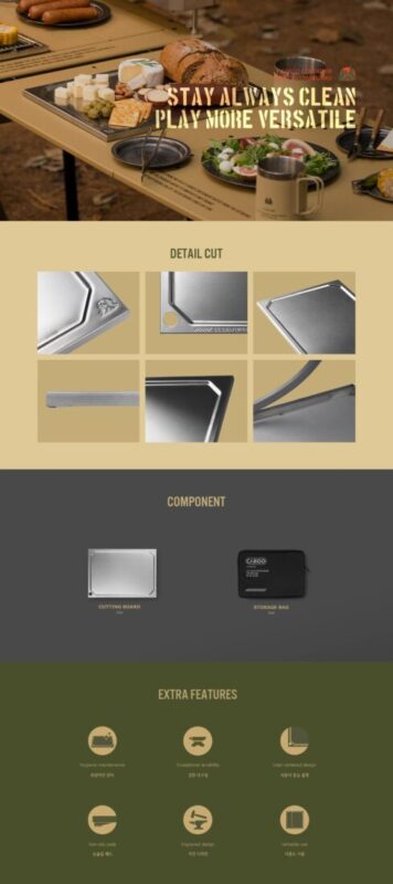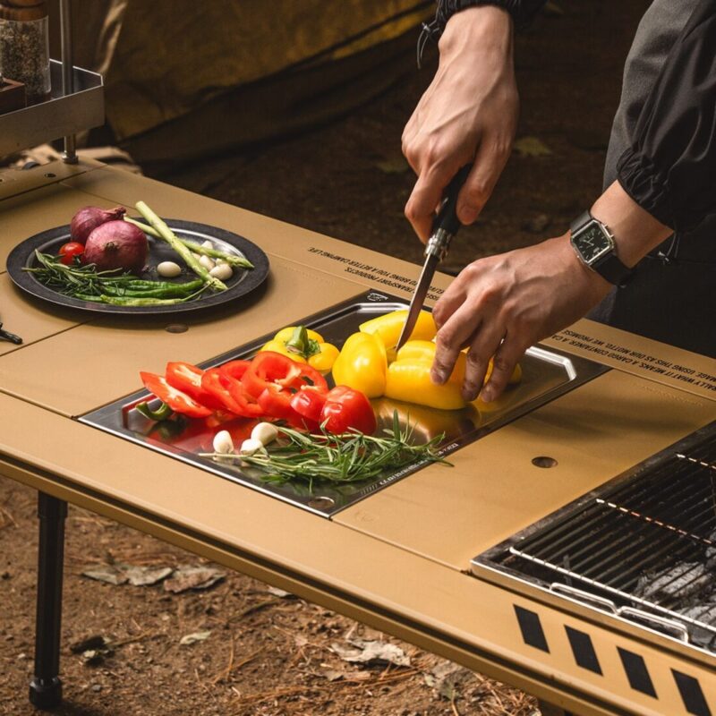 ยกระดับการทำอาหารในแคมป์ด้วย CC CLEAN CUTTING BOARD จากแบรนด์ Cargo Container เขียงสเตนเลสสตีลคุณภาพสูงที่ออกแบบมาอย่างพิถีพิถัน โดดเด่นด้วยดีไซน์ที่สามารถใช้งานร่วมกับโต๊ะระบบ IGT (Iron Grill Table) ได้อย่างลงตัว ไม่ว่าจะใช้หั่นวัตถุดิบ รองภาชนะร้อน หรือใช้เป็นถาดเพลตสำหรับเสิร์ฟอาหาร (Plating) ก็ทำได้สวยงามกลมกลืน พร้อมรับจบทุกมื้ออร่อยกลางแจ้งของคุณ