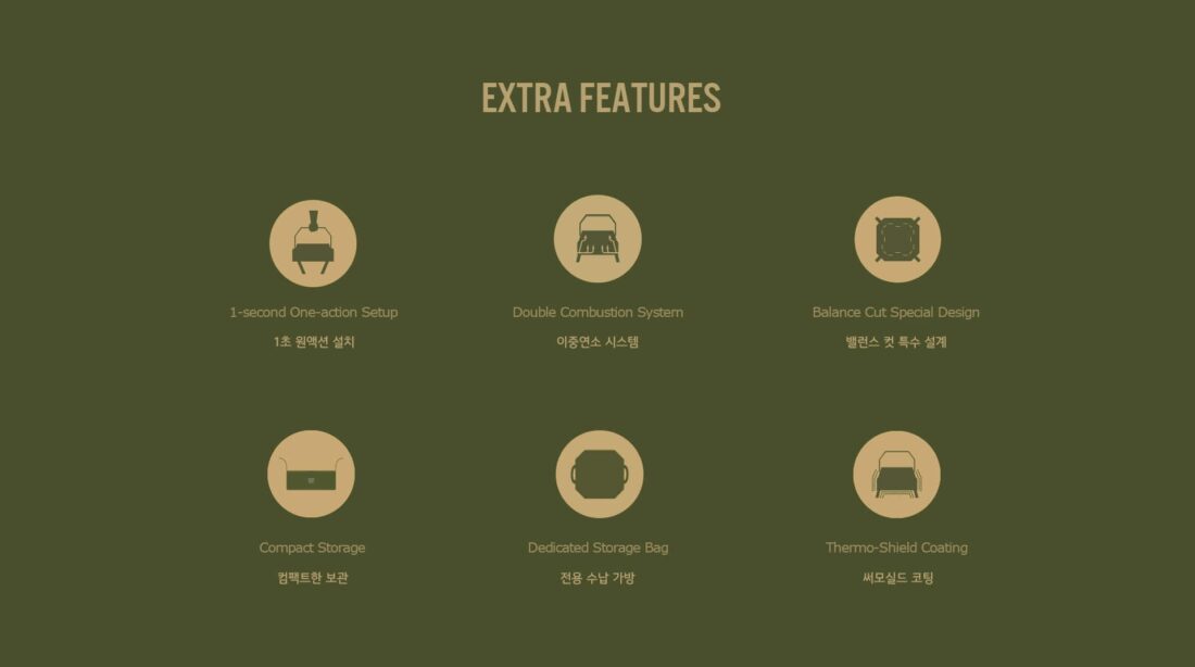 ระบบ One-Action กางและเก็บง่ายใน 1 วินาที ออกแบบมาเพื่อความสะดวกสูงสุด ไม่ต้องเสียเวลาประกอบชิ้นส่วนยุ่งยาก เพียงจับหูหิ้วแล้วดึงขึ้น ขาเตาจะกางออกพร้อมใช้งานทันที และเมื่อต้องการเก็บ เพียงยกห้องเผาไหม้ขึ้น ขาก็จะพับเก็บอัตโนมัติ ทำให้การตั้งแคมป์และการเก็บของเป็นเรื่องง่ายและรวดเร็ว