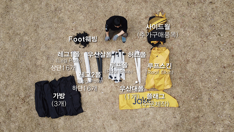 อุปกรณ์ที่ได้รับ : เชือก Ø3mm x 5m จำนวน 8 เส้น สมอบก (L) 8 ชิ้น, สมอบก (T) 4 ชิ้น, ธง 2 ผืนกระเป๋า 3 ใบ (สำหรับผ้าเต็นท์ 1 ใบ, สำหรับเสา 2 ใบ)