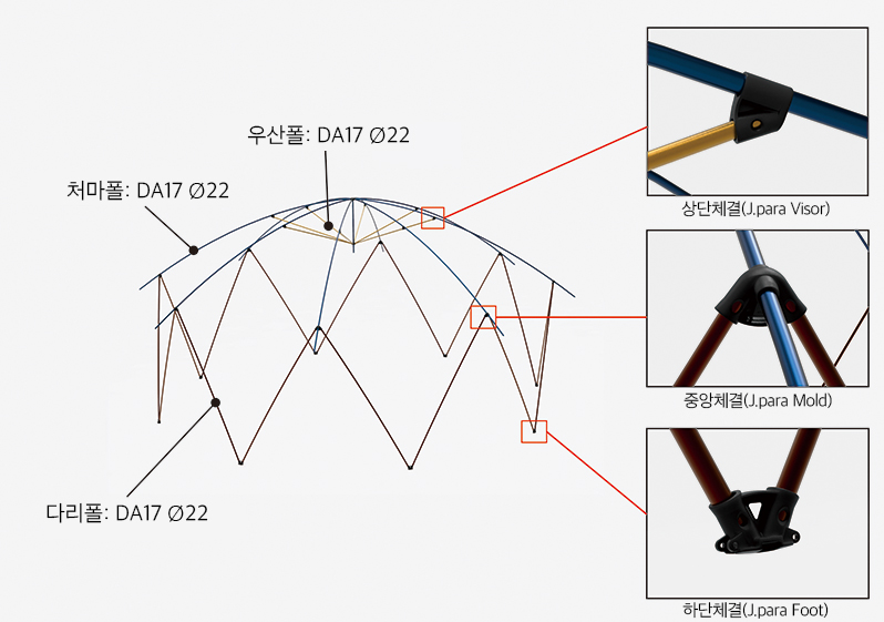 เต็นท์ขนาดใหญ่ แต่ด้วยโครงสร้างที่เบาและง่าย ใช้คนเพียง 2 คนสามารถติดตั้งได้ภายใน 20 นาที ใช้ผ้า 150d PR/pu/silicone ที่มีคุณสมบัติกันน้ำที่แรงดัน 2,000mm พร้อมทั้งกันเปื้อนและทนทาน J.para เคลือบด้วย PU ด้านในและซิลิโคนด้านนอก การเคลือบซิลิโคนช่วยให้น้ำไม่ซึมผ่านและเกาะตัวเป็นหยด ทำให้มีประสิทธิภาพในการกันน้ำที่ดีเยี่ยม ใช้เสา DAC รุ่น DA17 ที่มีชื่อเสียงระดับโลก ช่วยลดน้ำหนักของเสาและเพิ่มความทนทาน ใช้อุปกรณ์เชื่อมต่อที่พัฒนาโดย DAC โดยเฉพาะสำหรับ J.para 7.5 ทำให้ประกอบได้ง่ายและข้อต่อแต่ละจุดยึดติดแน่นหนา ผนังด้านข้างของ J.para 7.5 มีทั้งแบบตาข่ายและแบบผ้าทึบ สามารถเลือกใช้แบบใดแบบหนึ่งหรือผสมผสานกันได้ ช่วยเพิ่มร่มเงา ป้องกันแมลง ลม และฝน