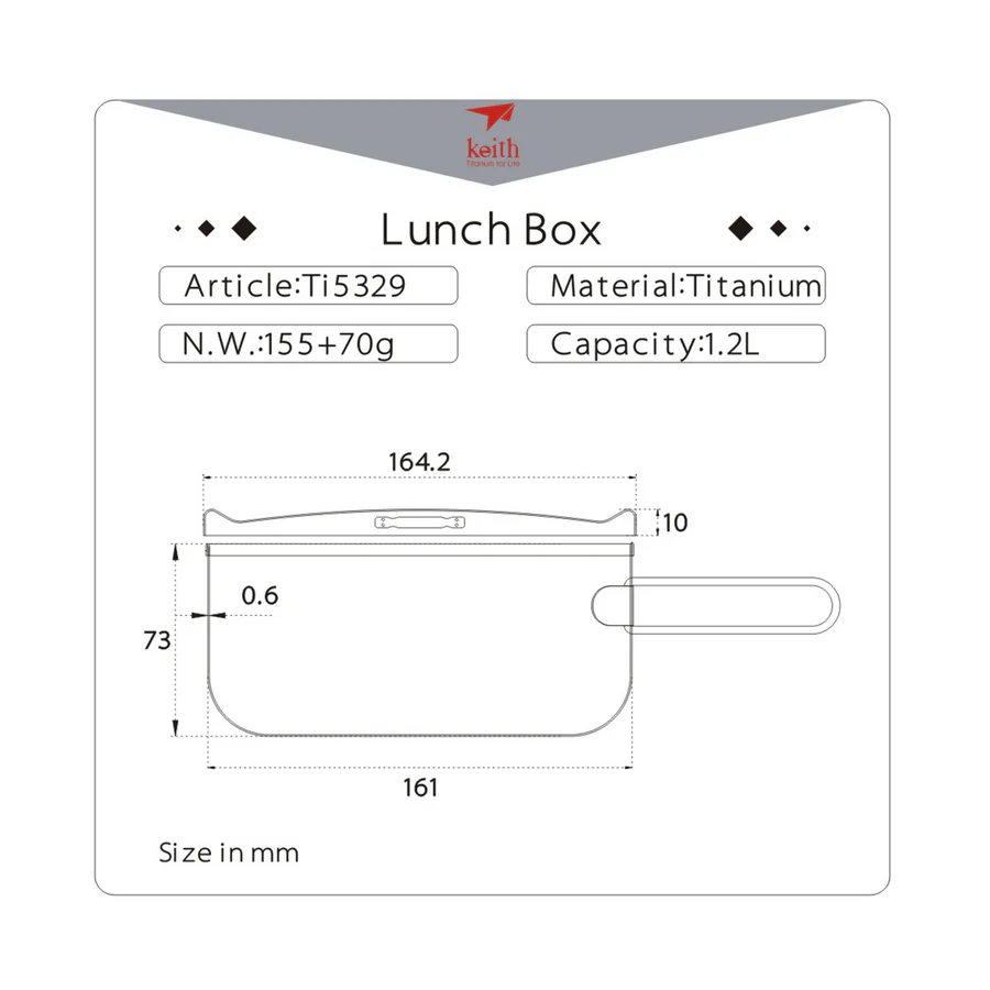 รายละเอียด : กล่องข้าวไทเทเนียม จาก Keith พร้อมฝาปิด ออกแบบมา 3 ขนาดคือ 800 ml , 1000 ml และ 1200 ml ผลิตจากโลหะไทเทเนียม น้ำหนักเบา ที่กล่องข้าวมีด้ามจับซึ่งผลิตจาก stainless steel ช่วยให้สามารถจับถ้วยได้แม้จะบรรจุของร้อนอยู่ มีฝาปิดที่ออกแบบมาอย่างดี มีช่องด้านข้างที่ออกแบบมาสำหรับให้ใช้ช้อนเกี่ยวเพื่อเปิดฝากล่องได้ สามารถใช้เป็นหม้อประกอบอาหาร หรือใช้เป็นกล่องใส่ข้าว สำหรับเดินทางได้
