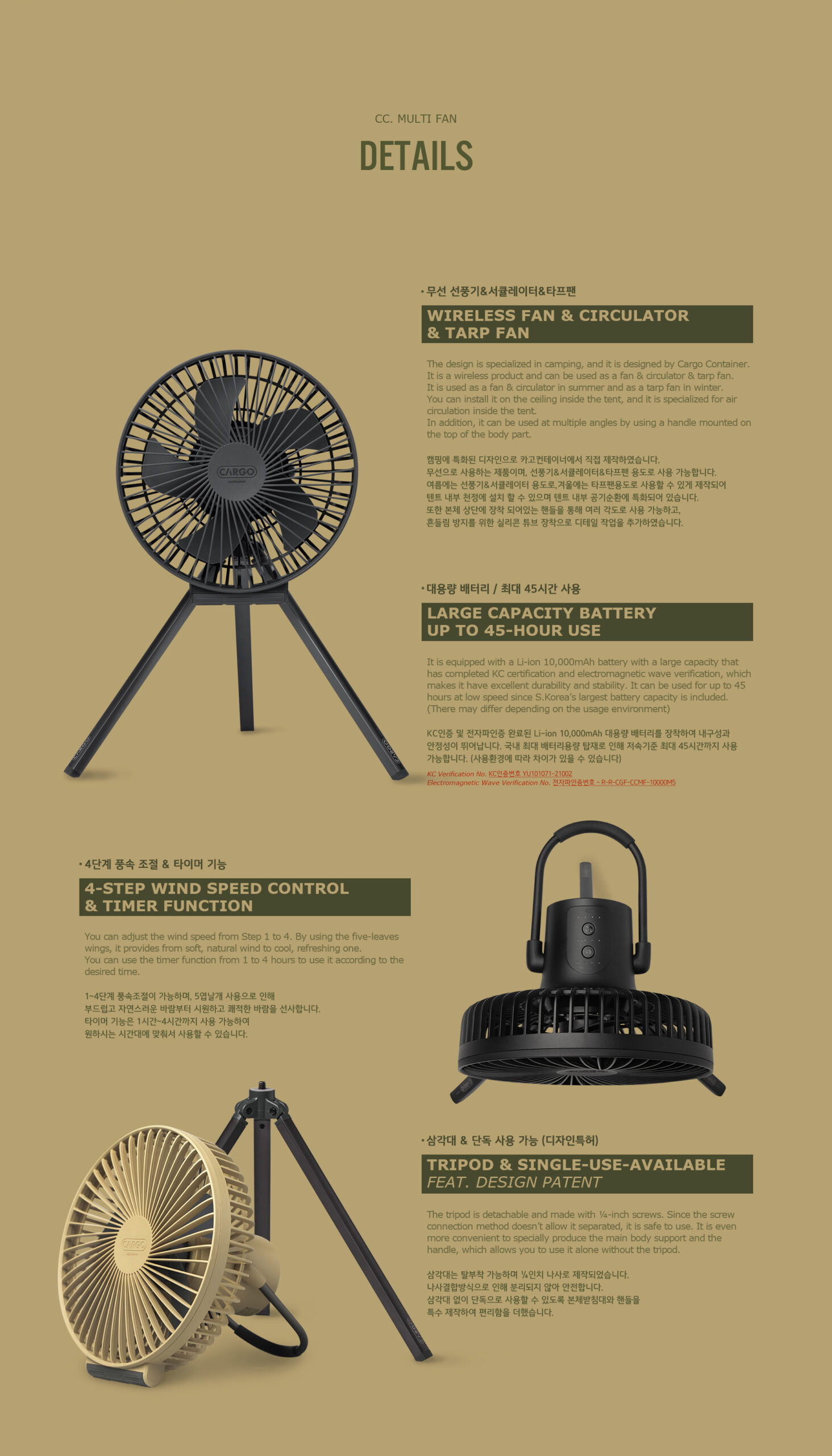 รายละเอียด : พัดลมพกพาจากแบรนด์ Cargo Container ประเทศเกาหลี ดีไซน์สุดเท่พร้อมฟังก์ชั่นการใช้งานยอดเยี่ยมที่ทำให้คุณอยากพกพาไปทุกที่ มีการไหลเวียนของอากาศอย่างทั่วถึงด้วยใบพัด 5 ใบ ปรับความเร็วลมได้ 4 ระดับ และมอเตอร์ BLDC ที่มีเสียงรบกวนต่ำ ดังนั้นจึงสามารถใช้เป็นพัดลมตัวโปรดได้ตลอดทั้งปี แบตเตอรี่ความจุสูง 10,000mAh เวลาในการชาร์จ ประมาณ 8.5 ชั่วโมง ระยะเวลาการใช้งาน ลมสูงสุดประมาณ 10 ชั่วโมง ~ ปริมาณลมต่ำสุดประมาณ 45 ชั่วโมง ซิลิกอนติดอยู่กับตัวเครื่อง จึงใช้งานได้อย่างมั่นคงโดยไม่สั่นแม้ว่าจะถอดขาตั้งออกแล้วก็ตาม ใช้งานได้หลากหลาย เช่น ตั้ง แขวน และขาตั้ง (ปรับมุมได้) มาพร้อมกับเคสหรือกระเป๋าจัดเก็บกันกระแทกที่สะดวกต่อการพกพา
