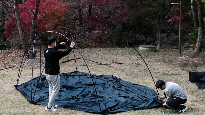 1. นำตัว Shelter ออกมาแล้วกางออกบนพื้นผิวเรียบ จากนั้นนำเสาออกมาแล้วประกอบเข้าด้วยกัน