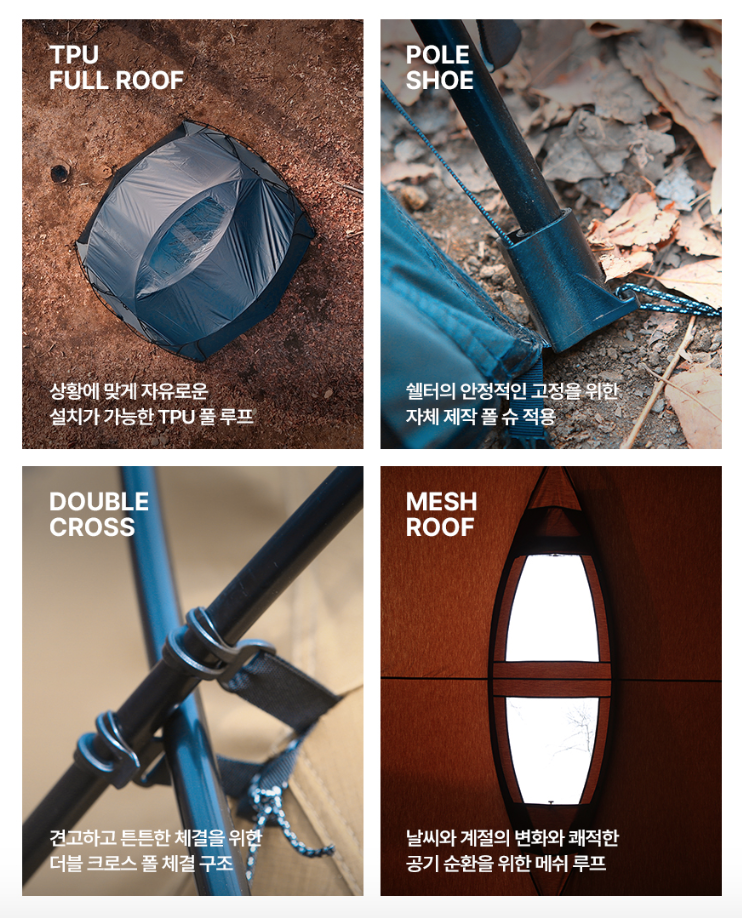 ใช้โครงสร้างเสาไขว้คู่ ใช้เสาหลัก 2 เสาและเสาด้านข้าง 2 เสา ที่ทำจากวัสดุดูราลูมิน สามารถติดตั้งได้ง่าย ช่องระบายอากาศ 4 จุดเพื่อการไหลเวียนของอากาศที่ราบรื่น มีระบบระบายอากาศป้องกันการควบแน่นและการไหลเวียนของอากาศได้อย่างมีประสิทธิภาพ