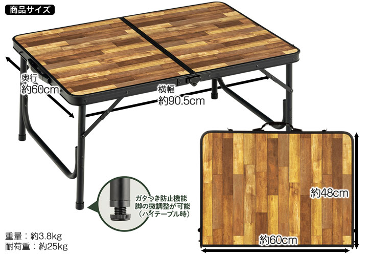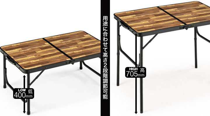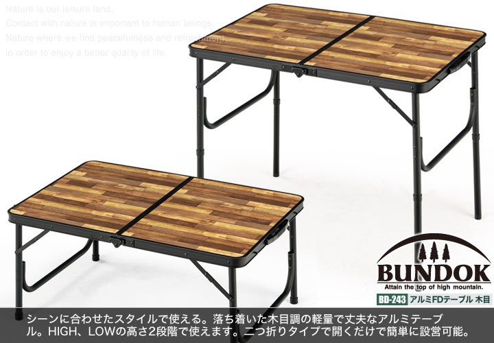 รายละเอียด : โต๊ะอลูมิเนียมที่น้ำหนักเบาและทนทาน สามารถใช้งานได้ 2 ระดับ คือ HIGH และ LOW ด้านบนเป็นลายไม้สวยงาม พับเก็บได้ มีหูหิ้วพกพาสะดวก