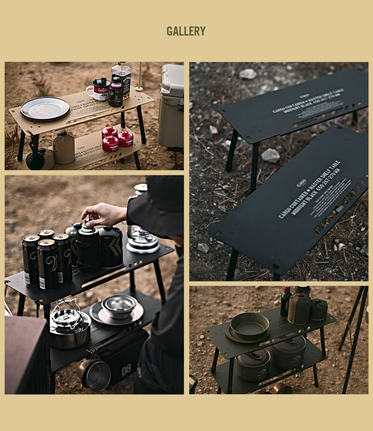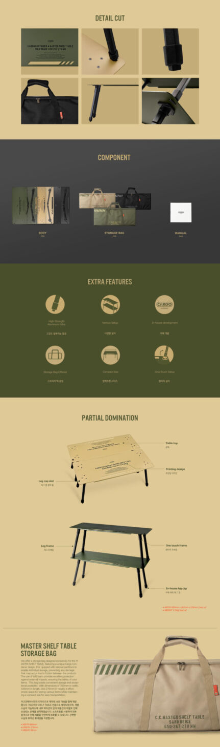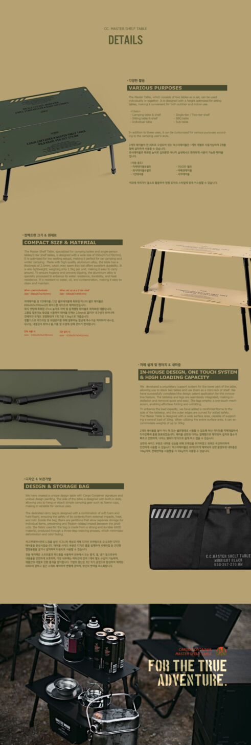 รายละเอียด : โต๊ะ MASTER SHELF TABLE สำหรับชาวแคมป์โดยเฉพาะ ออกแบบมาให้ใช้งานได้หลากหลายตามสไตล์ของผู้ใช้งาน ในชุดประกอบด้วยโต๊ะ 2 ตัว ซึ่งสามารถใช้เป็นชั้นวาง 2 ชั้นเมื่อติดตั้งในแนวตั้ง หรือใช้เป็นโต๊ะรับประทานอาหารแบบเตี้ยเมื่อใช้งานในแนวนอน เราพัฒนาผ้าหุ้มขาโต๊ะของเราเองขึ้นมาเพื่อยึดโต๊ะด้านล่างให้มั่นคงเมื่อใช้เป็นชั้นวาง นอกจากนี้ โต๊ะและขายังทำเป็นชิ้นเดียว ช่วยให้ติดตั้งและถอดชิ้นส่วนได้ง่ายและรวดเร็ว