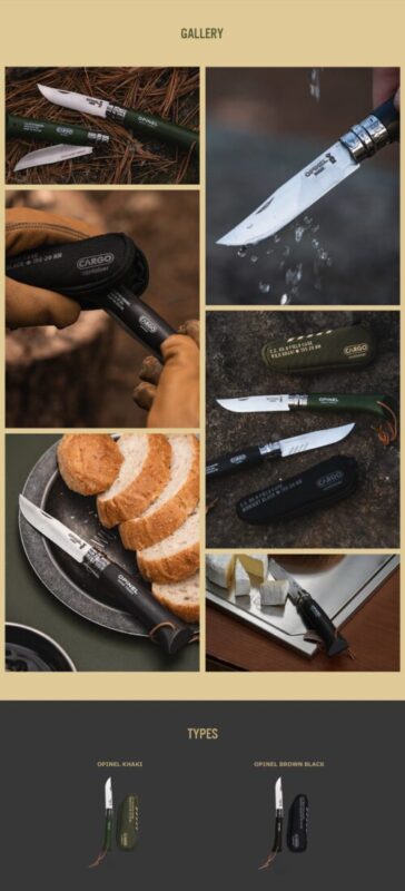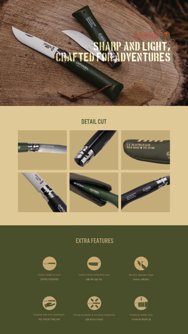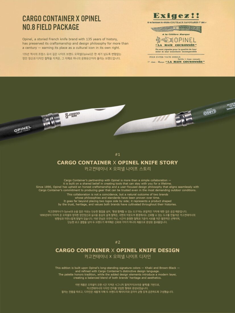 • คอลแลปส์สุดเอ็กซ์คลูซีฟ (Cargo Container x Opinel): ยกระดับด้ามจับไม้บีช (Beechwood) ดั้งเดิมด้วยการทำสี พิมพ์ลายกราฟิกและสลักโลโก้ Cargo Container อย่างประณีต พร้อมสายหนังแท้ (Leather Cord) สไตล์แคมป์ปิ้ง