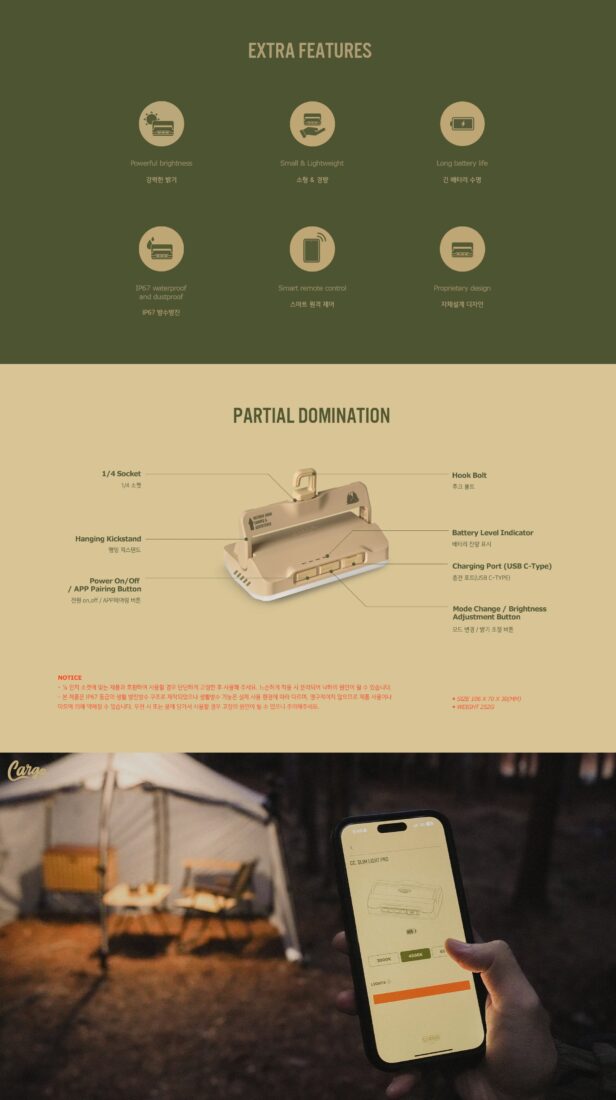พกพาสะดวกและใช้งานได้หลากหลาย SLIM LIGHT PRO ยังคงประสิทธิภาพอันทรงพลังไว้ในขนาดกะทัดรัดเพียง 106x70x30 มม. และน้ำหนักเบาแค่ 252 กรัม ทำให้คุณพกพาไปได้ทุกที่โดยไม่รู้สึกเป็นภาระ มาพร้อมเทคโนโลยีเฉพาะของ Cargo Container ขาตั้ง (Kickstand) ที่ปรับระดับได้ และช่องเกลียวขนาด ¼ นิ้วสำหรับติดตั้งกับอุปกรณ์เสริมต่างๆ เพิ่มทางเลือกในการแขวนหรือติดตั้งที่หลากหลาย เหมาะอย่างยิ่งสำหรับการแคมป์ปิ้ง พื้นที่ทำงาน และอื่นๆ อีกมากมาย
