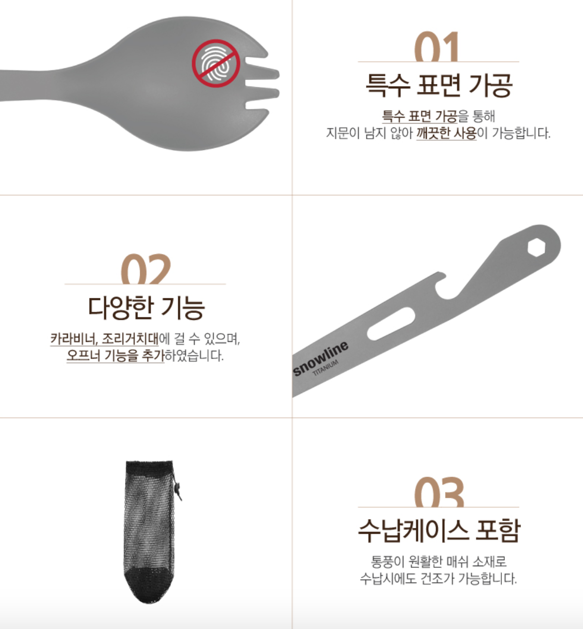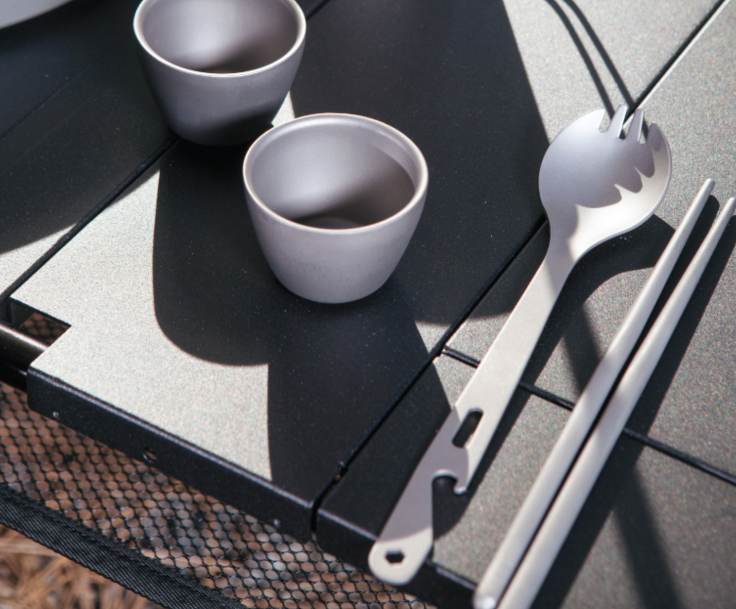 ช้อน+ซ่อม 2in1 วัสดุไทเทเนียม น้ำหนักเบา ทนต่อการกัดกร่อน ปลอดภัยสำหรับอาหาร ด้านปลายช้อนสามารถใช้เป็นที่เปิดขวดได้ มาพร้อมถุงตาข่ายสำหรับจัดเก็บ