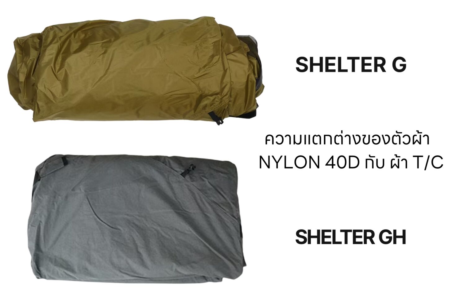 ในบทความนี้ผมเลยรวบรวมความเหมือนและความแตกต่างมาให้ครับ สำหรับความแตกต่างที่ชัดเจนคือ “ผ้า” ของ Shelter g ผ้า Nylon 40D ส่วนรุ่น GH ที่เปลี่ยนมาใช้ผ้า T/C (ผ้าฝ้ายผสมโพลีเอสเตอร์) ที่ระบายอากาศได้ดีเพื่อให้ได้ความรู้สึกสบายยิ่งขึ้น เป็น Shelter อเนกประสงค์ ที่สามารถใช้ในสภาพแวดล้อมกลางแจ้งต่างๆได้อย่างดีขึ้นในเมืองไทยแต่ก็ยังมีความแตกต่างเล็กๆน้อยๆอีกเราไปดูกันครับ